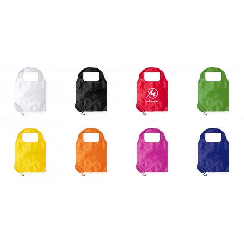 Bolsa plegable en llamativos colores. De suave poliéster 190T, con cómodas asas y con cordón a juego. Accesorio de ajuste para fácil plegado.