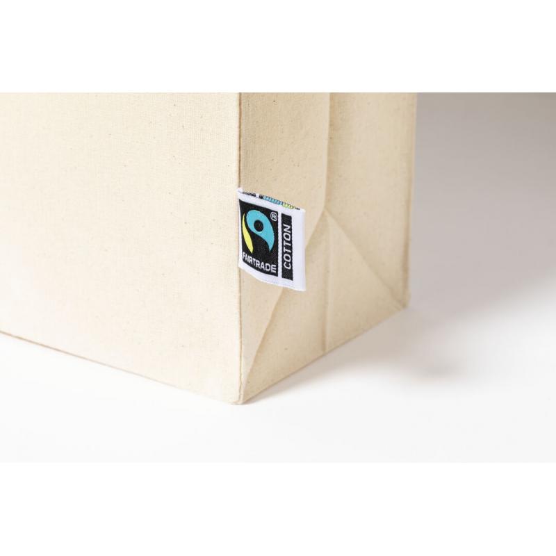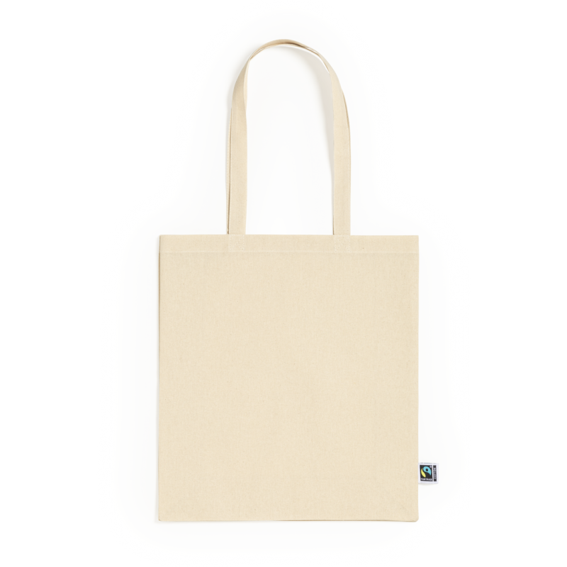 Bolsa de línea nature, fabricada en 100% algodón de 180g/m2 en tono natural. Con certificación Fairtrade (Comercio Justo) un sistema comercial solidario y alternativo al convencional que persigue el desarrollo de los pueblos y la lucha contra la pobreza. De acabado cosido con fuelle, asas largas reforzadas de 70cm y resistencia hasta 7kg de peso. Incluida etiqueta Fairtrade y hangtag distintivo en cartón reciclado.