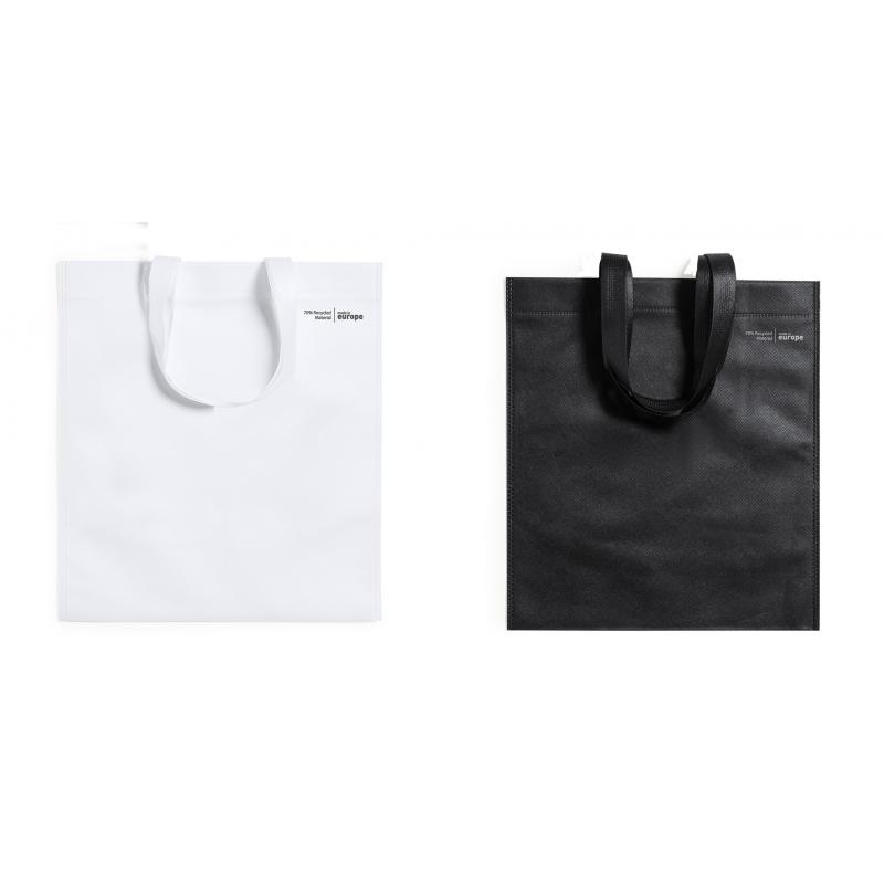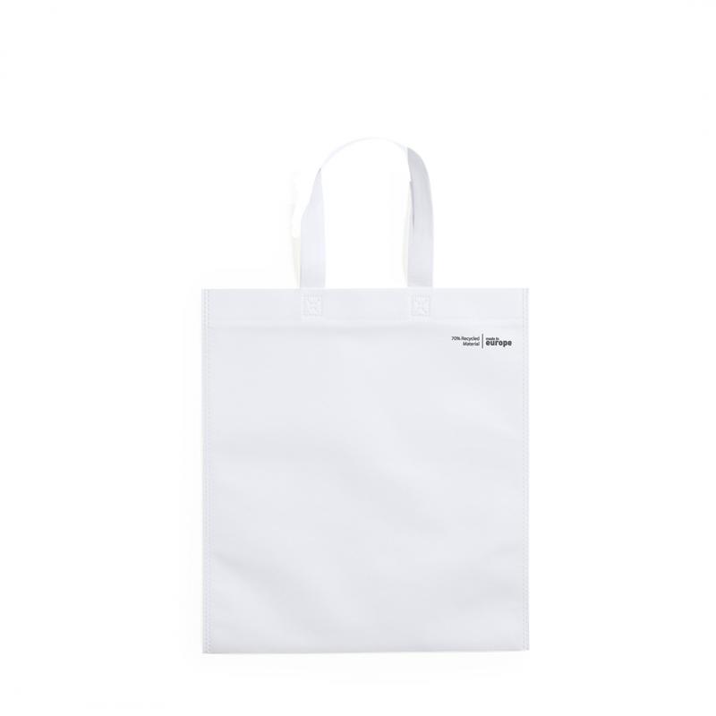 Bolsa de línea nature en non-woven reciclado de 70g/m2. De fabricación europea, con acabado termosellado, asas cortas y distintivo eco/made in sobre la bolsa.