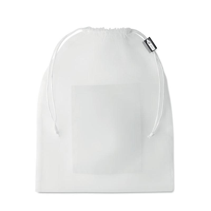 Bolsa rejilla para comida de RPET con bolsillo frontal para el marcaje del logo y cuerda de PP blanco en la parte superior para el cierre de la bolsa.