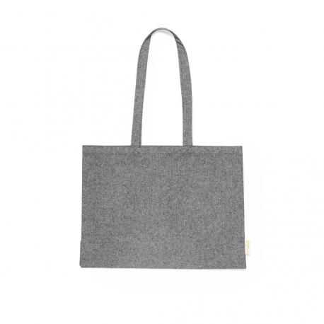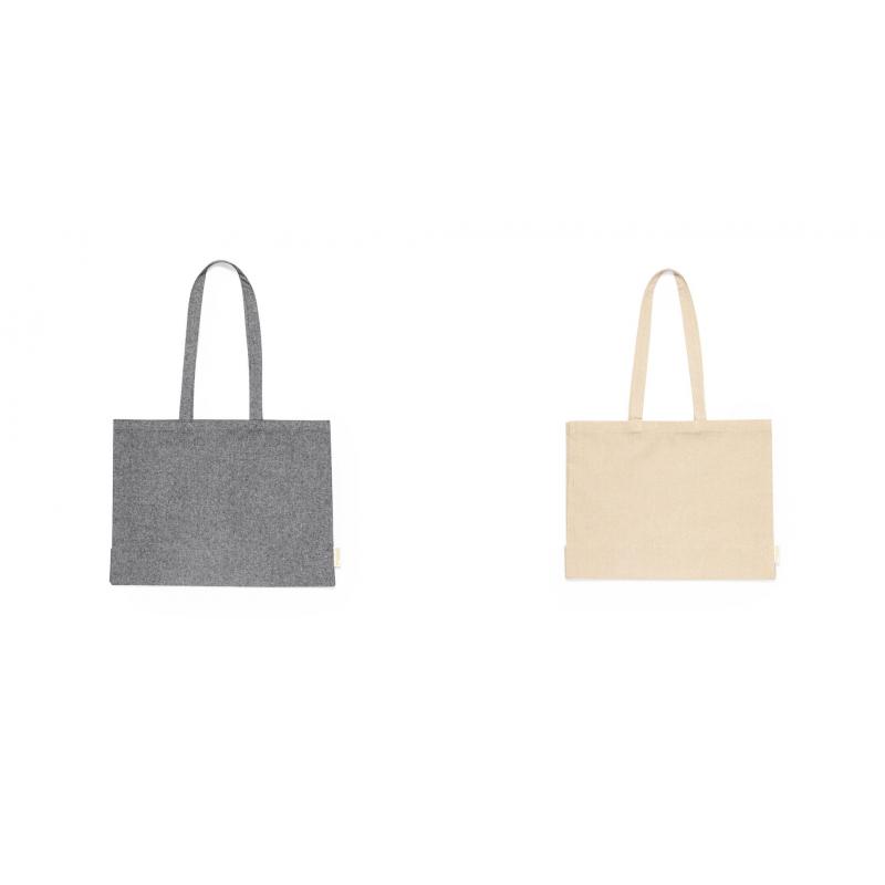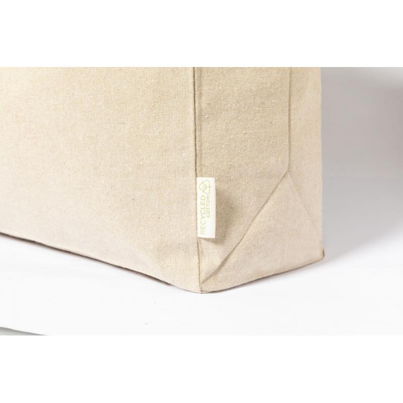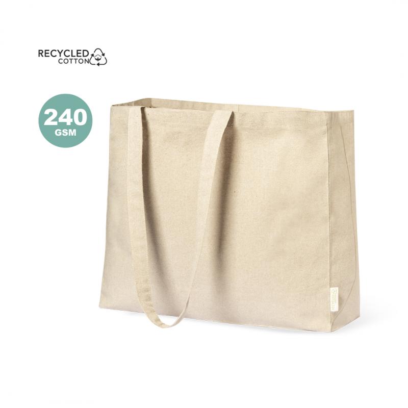 Bolsa de línea nature, fabricada en algodón reciclado de alto gramaje (240g/m2). De acabado cosido y con asas largas reforzadas (70 x 2,5 cm). Con fuelle y disponible en colores natural y negro, con distintivo algodón reciclado en etiqueta exterior. Resistencia hasta 10 kg de peso.Certificación GRS (Global Recycled Standard / Estándar de Reciclaje Global), que garantiza el origen reciclado del material usado para fabricar el producto
