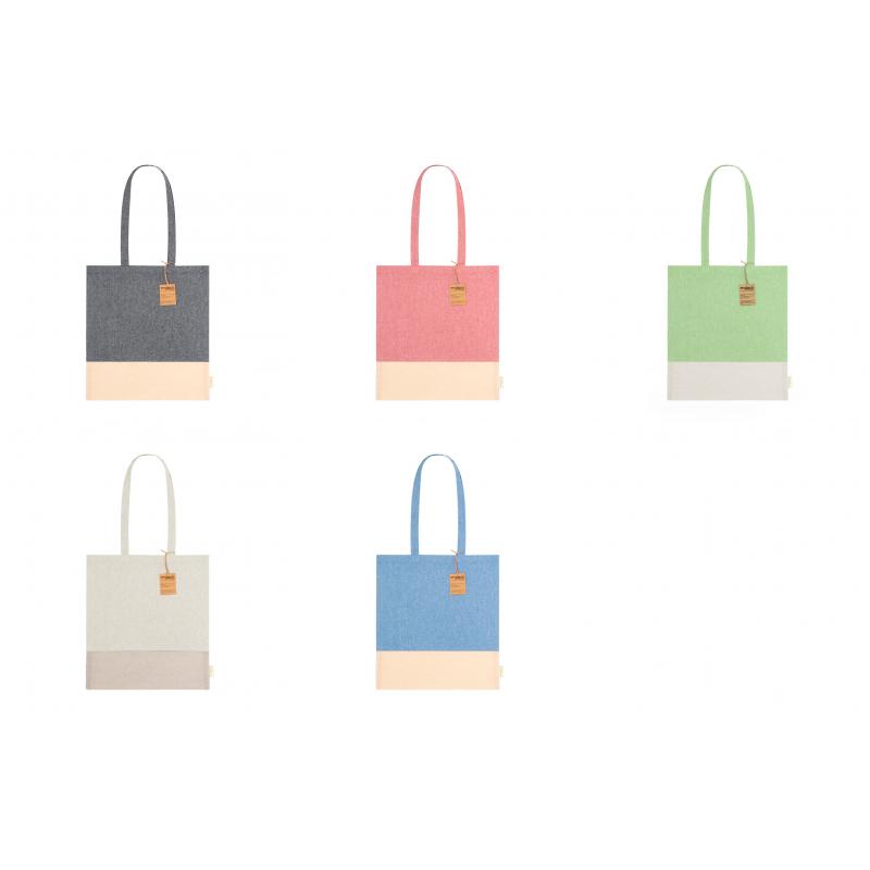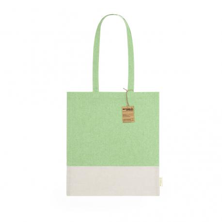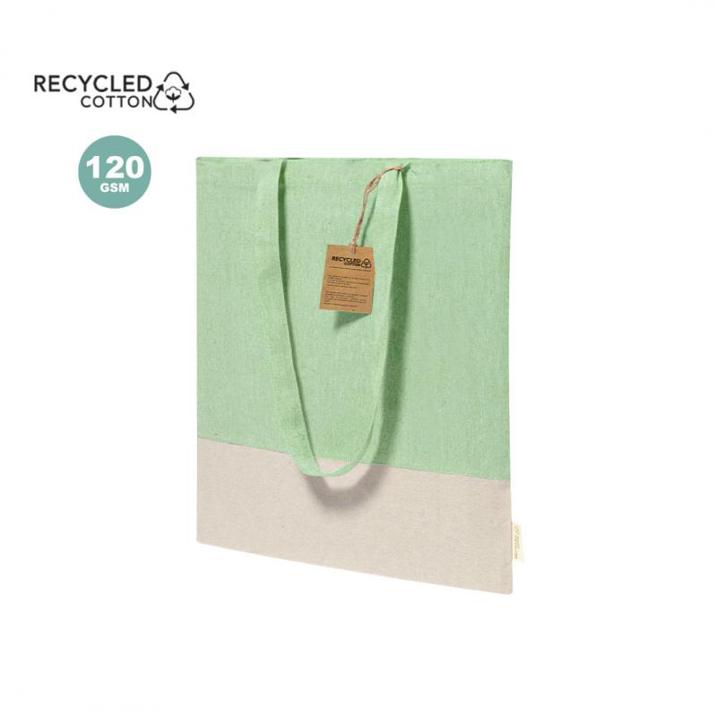 Bolsa en material 100% algodón reciclado de 120 g/m2. Asas largas de 70cm con refuerzo y de acabado cosido. Logotipo en etiqueta lateral y resistencia hasta 8 kg de peso. Disponible en variada gama de colores nature con base de color natural.