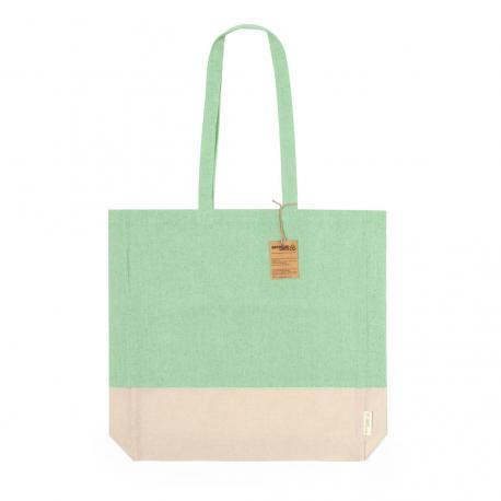 Bolsa en material 100% algodón reciclado de 120 g/m2. Asas largas de 70cm con refuerzo, de acabado cosido y fuelle. Logotipo en etiqueta lateral y resistencia hasta 8 kg de peso. Disponible en variada gama de colores nature con base de color natural.
