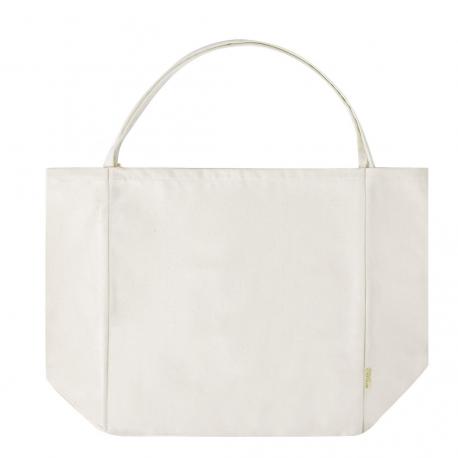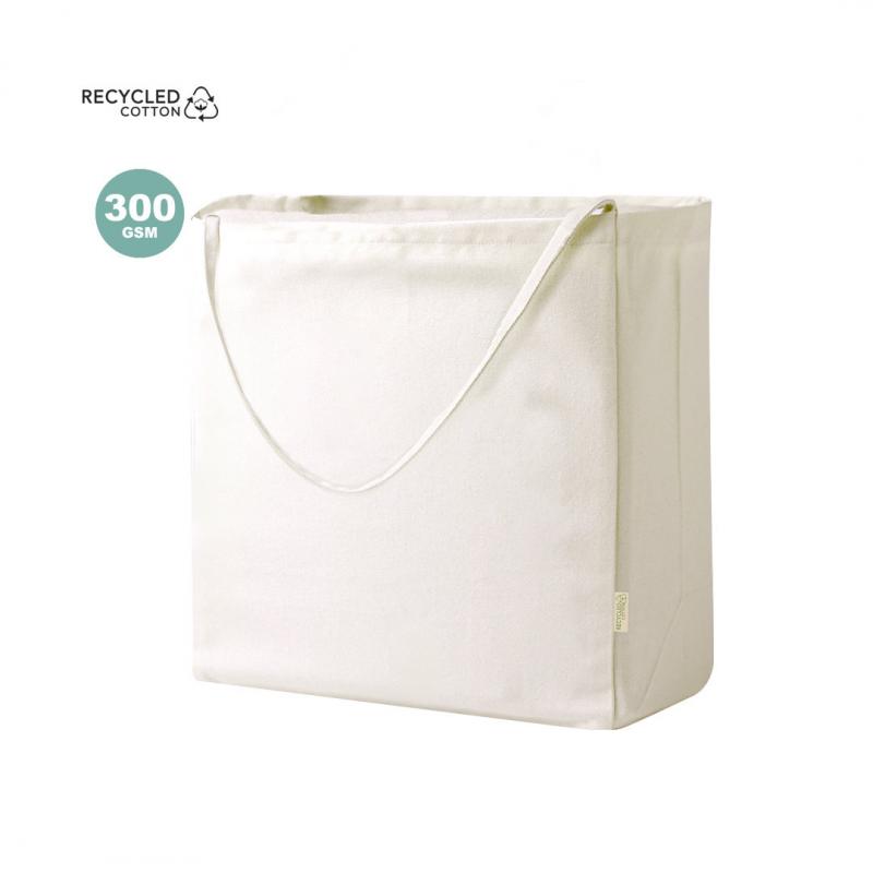 Bolsa en material 100% algodón reciclado de 300 g/m2. Asas largas de 60cm con refuerzo, de acabado cosido y fuelle. Logotipo en etiqueta lateral y resistencia hasta 12 kg de peso. Disponible en color natural.
