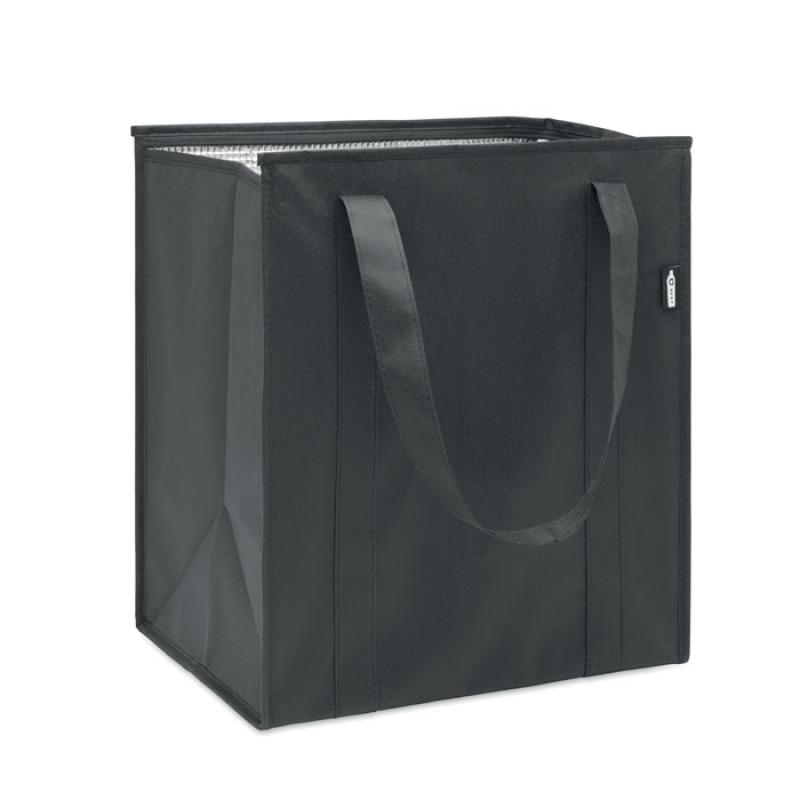 Bolsa nevera en RPET no tejido (non woven) de 80gr/m². Material de aislamiento: papel de aluminio. Capacidad 25L. Compartimento principal con cremallera en la parte superior y refuerzo de cartón PP extraíble.Recipiente :