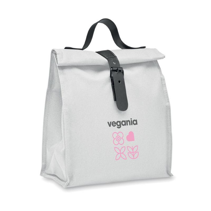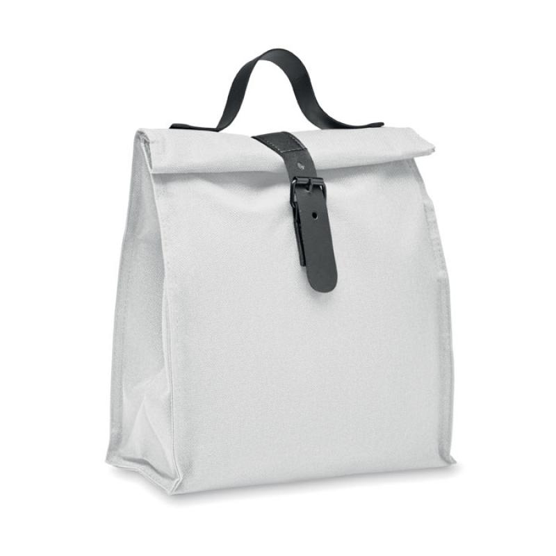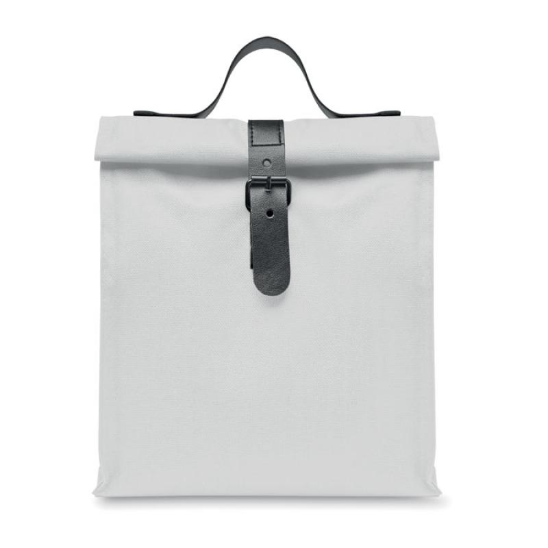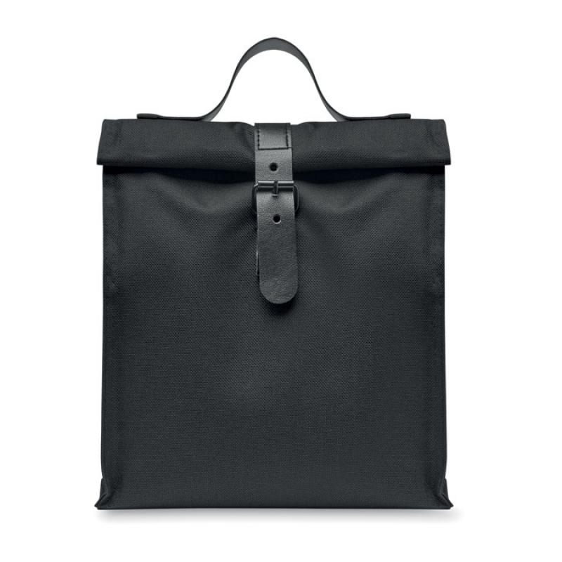 Bolsa nevera rolltop aislante de poliéster RPET 600D con asa y cierre de PU. Aislamiento: espuma PE de 3 mm con PEVA.Recipiente :