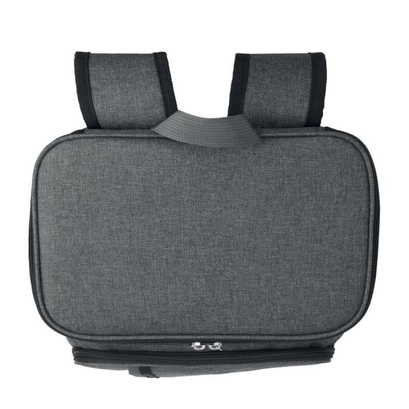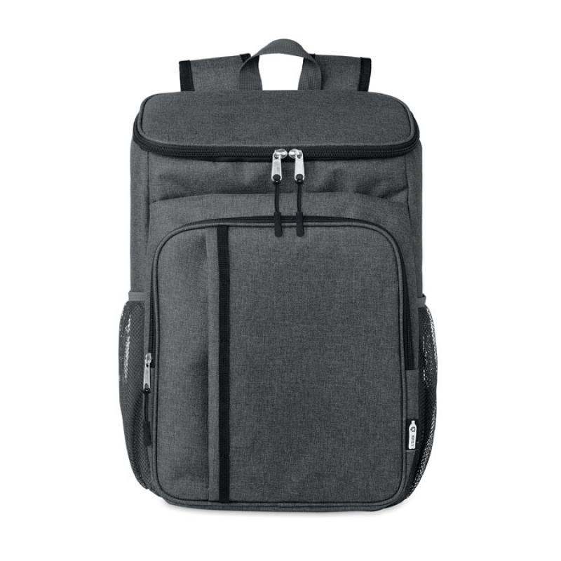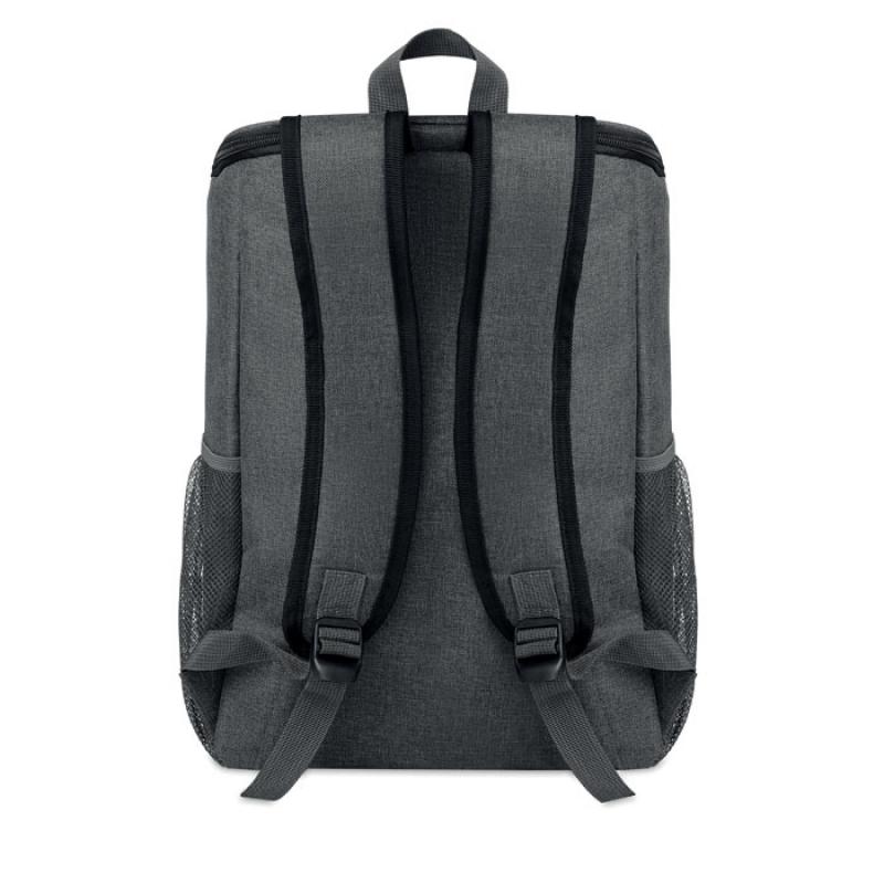 Mochila nevera jaspeada para picnic en RPET 600D. Incluye accesorios de mesa para 2 personas: cuchillo, tenedor y cuchara de acero inoxidable, PP y vaso de paja de trigo.