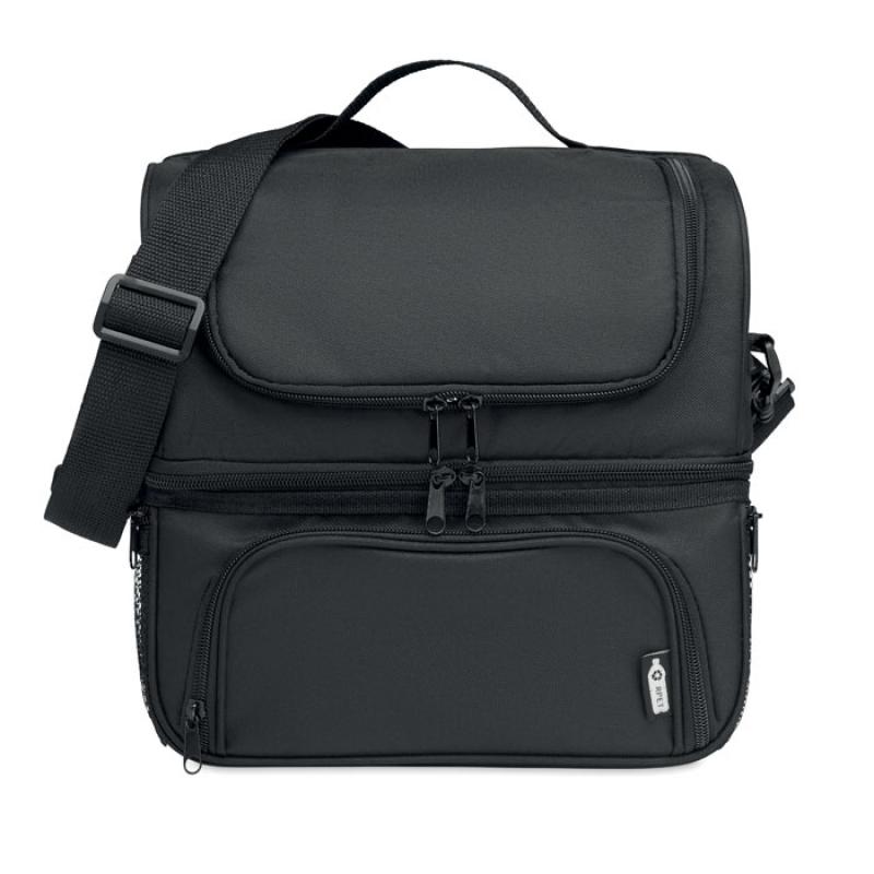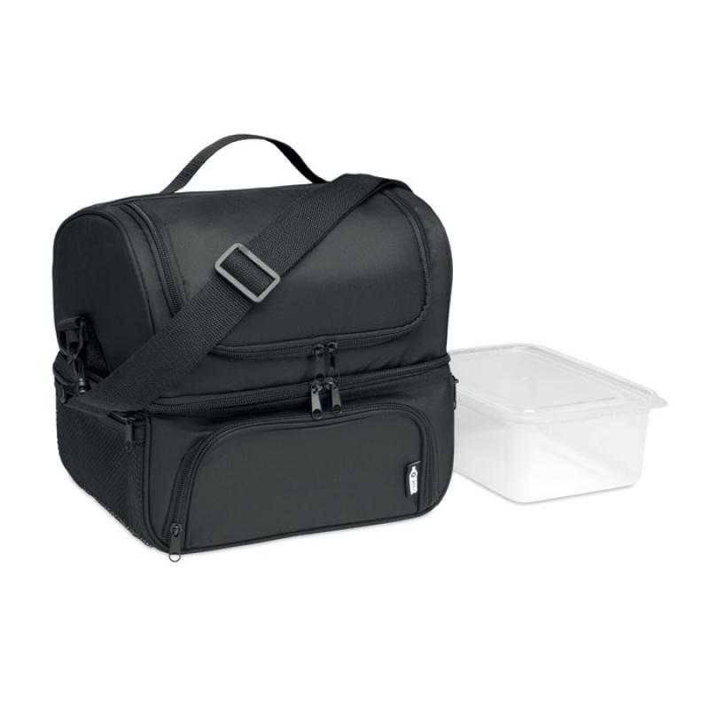 Bolsa nevera de 600D RPET, incluye una fiambrera de PP con capacidad para 1900 ml. Con 2 compartimentos para alimentos calientes y fríos por separado. Bandolera ajustable y desmontable. Aislamiento aluminio de 2 mm.