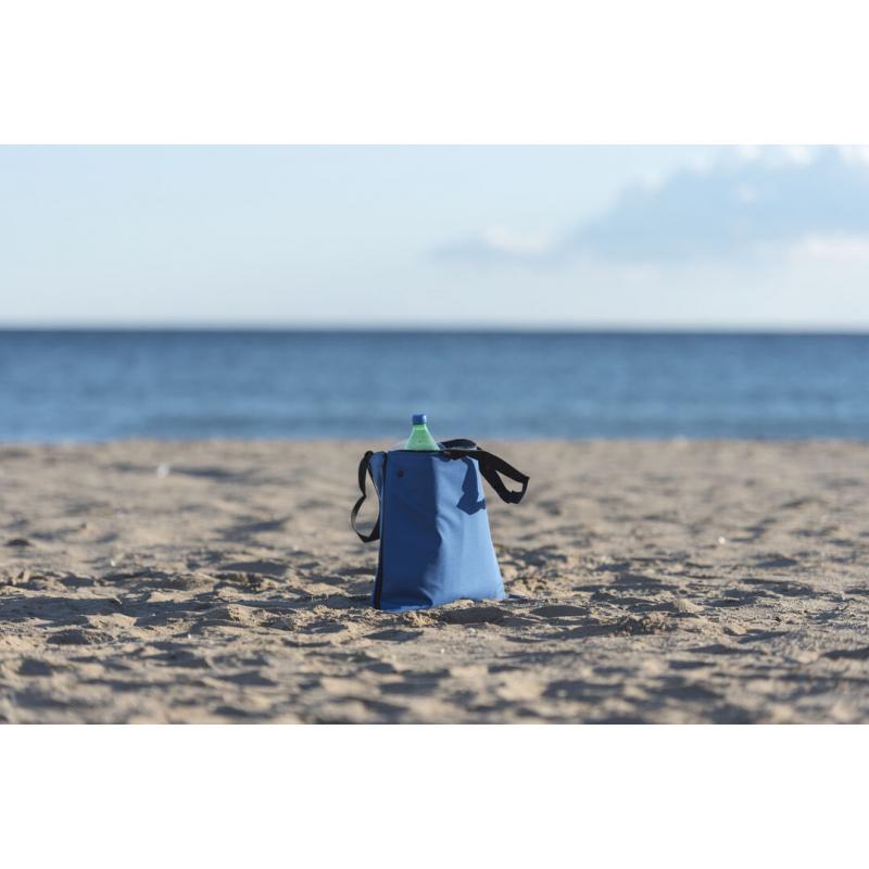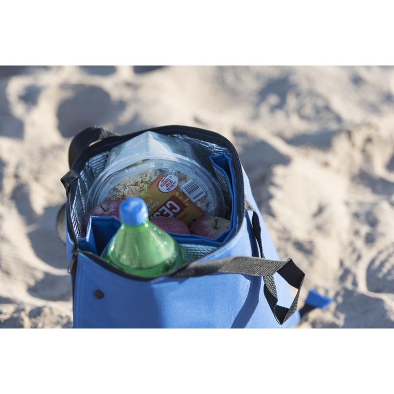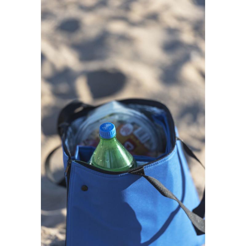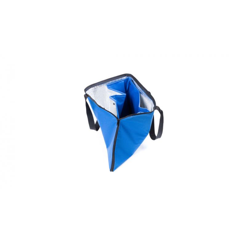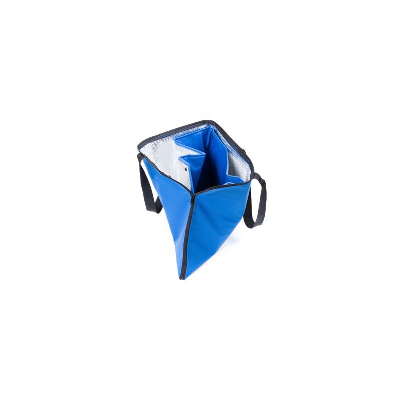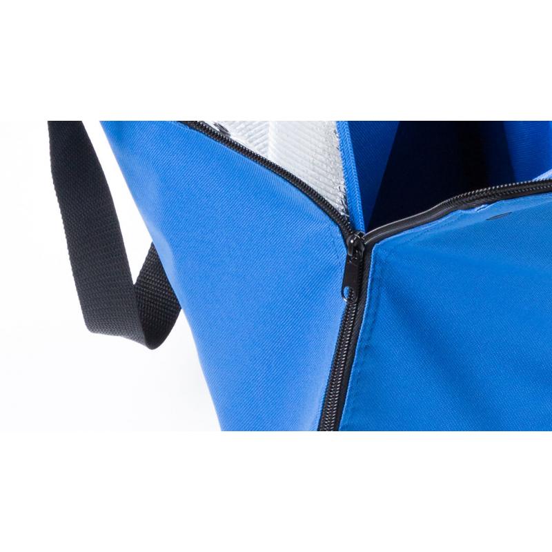 Bolsa nevera en resistente poliéster 600D con cierre de cremallera de apertura total. Con cómodas asas de transporte en nylon, refuerzos con cierre de corchete en esquinas superiores e interior isotermo en acabado de aluminio