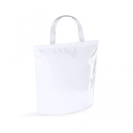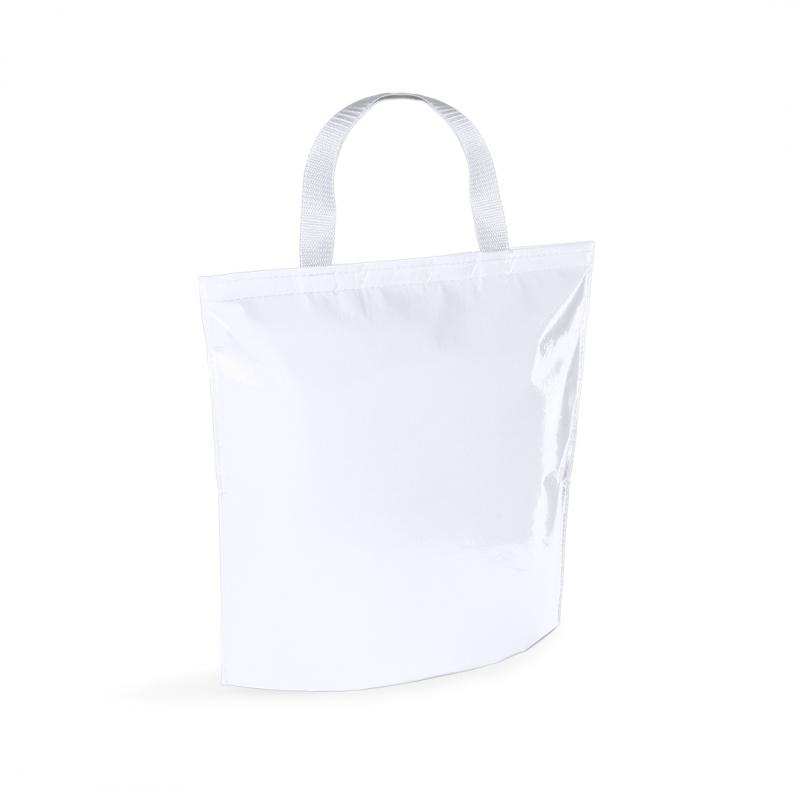 Bolsa nevera en resistente non-woven de acabado laminado brillante y cierre de velcro. Con cómodas asas de transporte en nylon a juego e interior isotermo en acabado de aluminio. Resistencia hasta 7kg de peso.