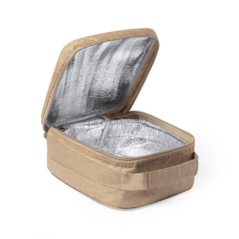 Nevera de línea nature, fabricada en papel reciclado. Con dos compartimentos independientes de cierre de cremallera con tiradores metálicos. Asa de transporte reforzada e interior isotermo en aluminio.