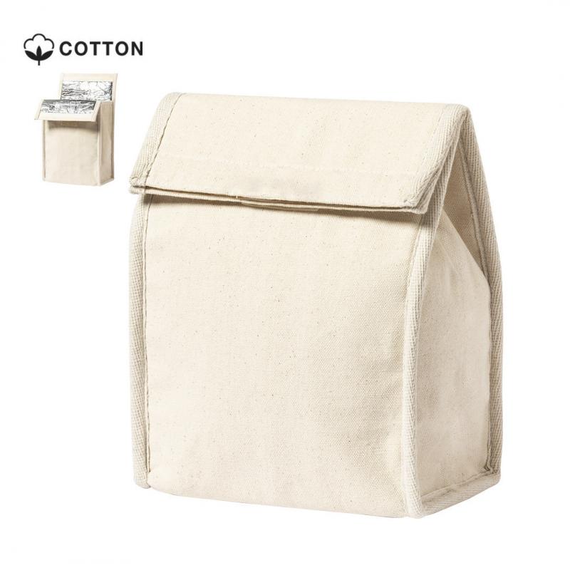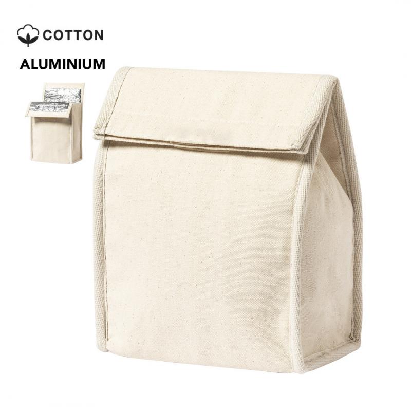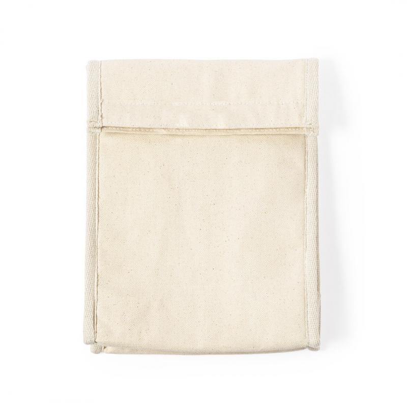 Bolsa térmica en resistente material 100% algodón de 330g/m2. Compartimento principal con cierre de velcro e interior isotermo de aluminio. Capacidad 2,3l.