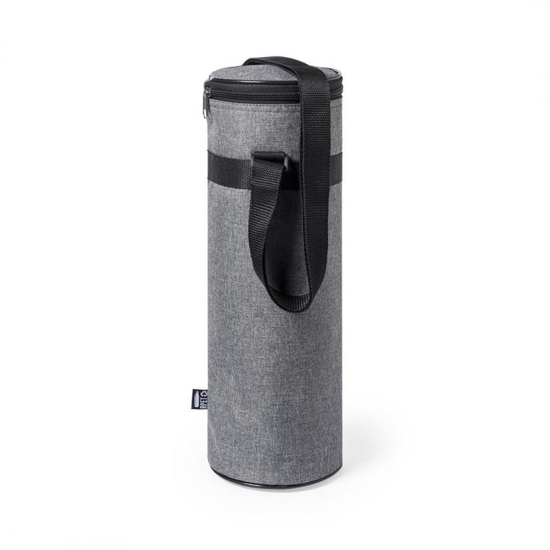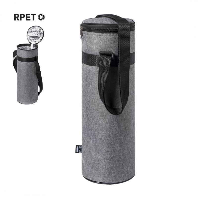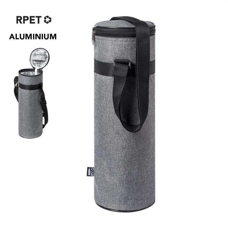 Nevera de línea nature para botellas de hasta 1,5l, fabricada en resistente poliéster 300D RPET, elaborado a partir de plástico reciclado para así fomentar la reutilización de residuos plásticos y contribuir a la sostenibilidad del planeta. Con cierre de cremallera y cómoda cinta para hombro ajustable. Interior isotermo en aluminio, con distintivo RPET en etiqueta.