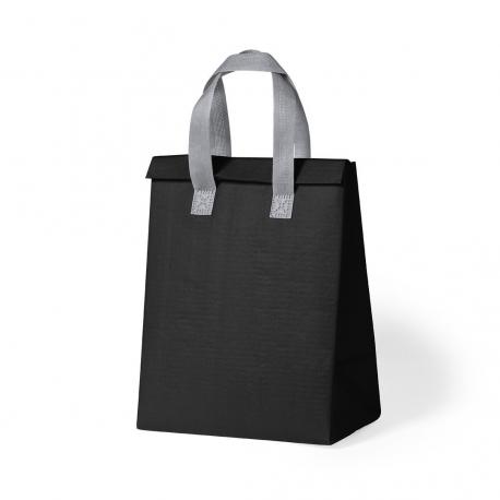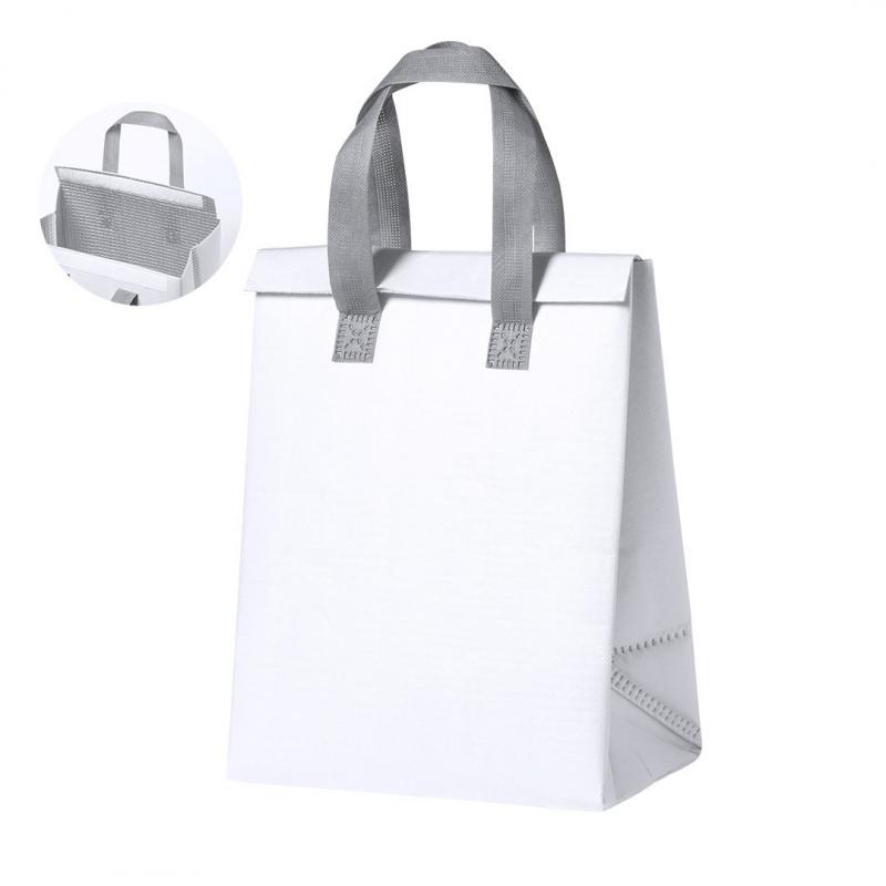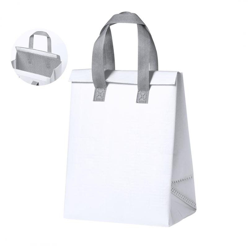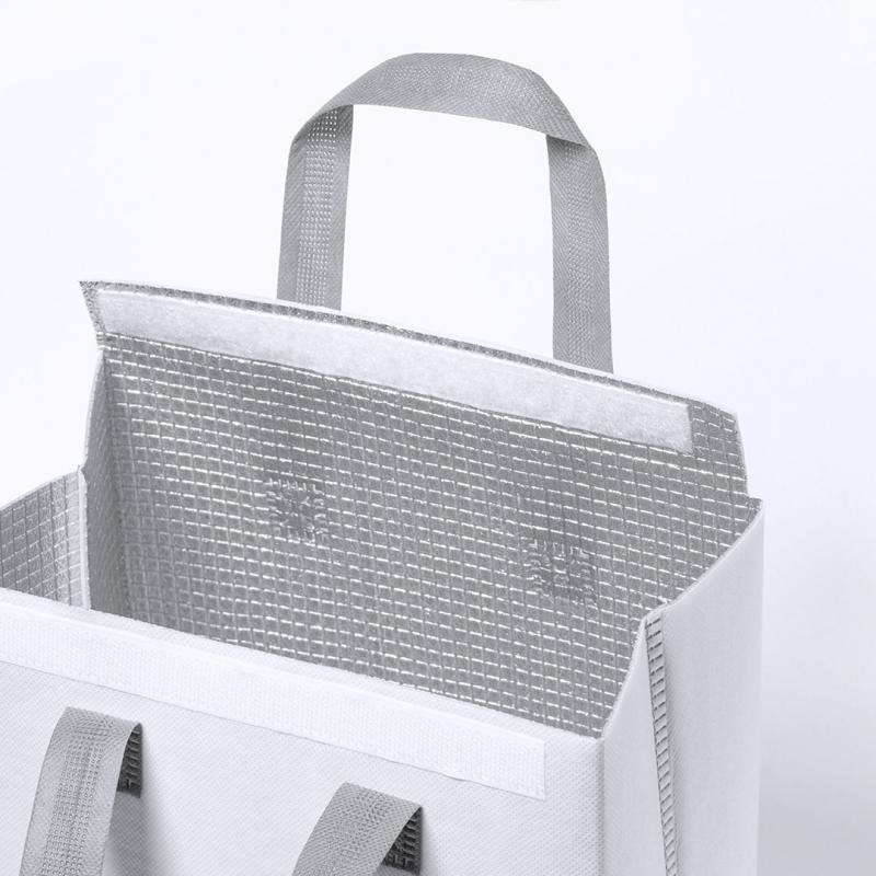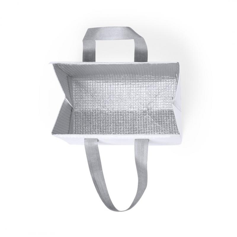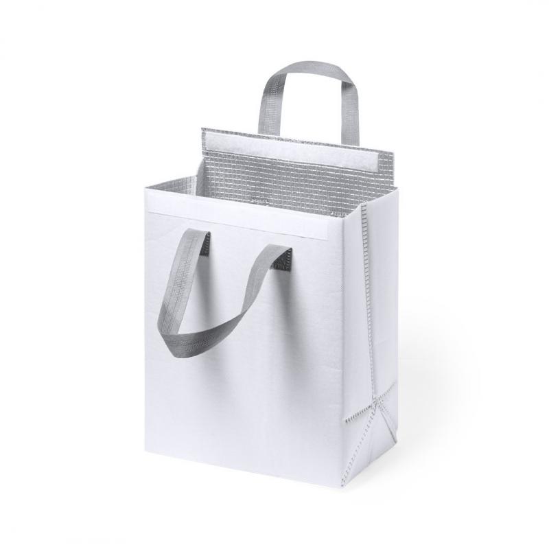 Bolsa nevera en non-woven laminado. Compartimento principal con cierre de velcro e interior isotermo de aluminio. De acabado termosellado, con fuelle y asas reforzadas. Disponible en variada gama de colores.