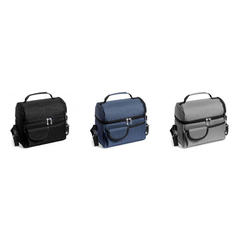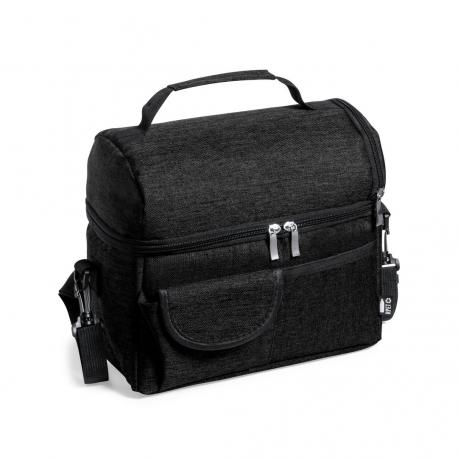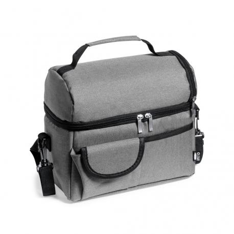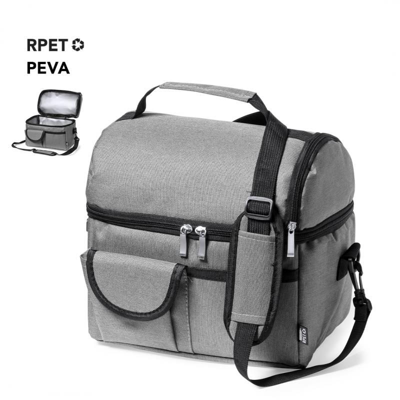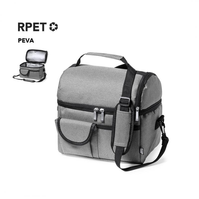 Nevera fabricada en resistente 600D RPET. Incluye 2 compartimentos independientes, con cierre de cremallera y tiradores metálicos. Interior isotermo en PEVA, con cinta bandolera ajustable y acolchado para hombro a juego. Bolsillo trasero de redecilla elástica y dos bolsillos frontales, uno de ellos con cierre de velcro. Etiqueta exterior con distintivo RPET, disponible en variada gama de colores. El material RPET se elabora a partir de plástico reciclado, para así fomentar la reutilización de residuos plásticos y ayudar a la sostenibilidad del planeta.