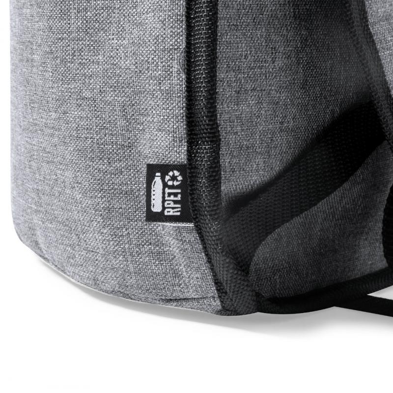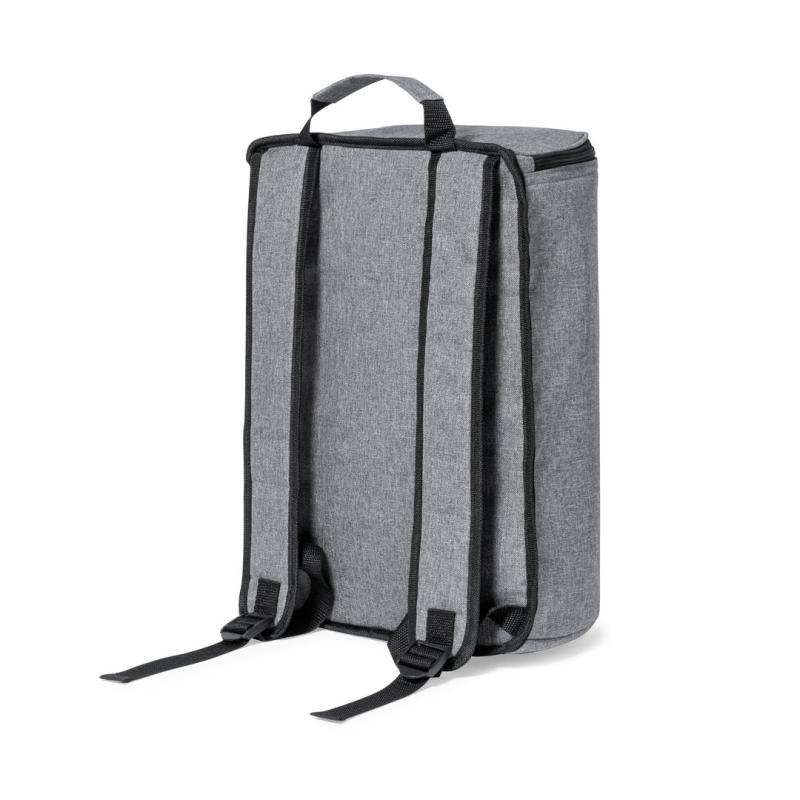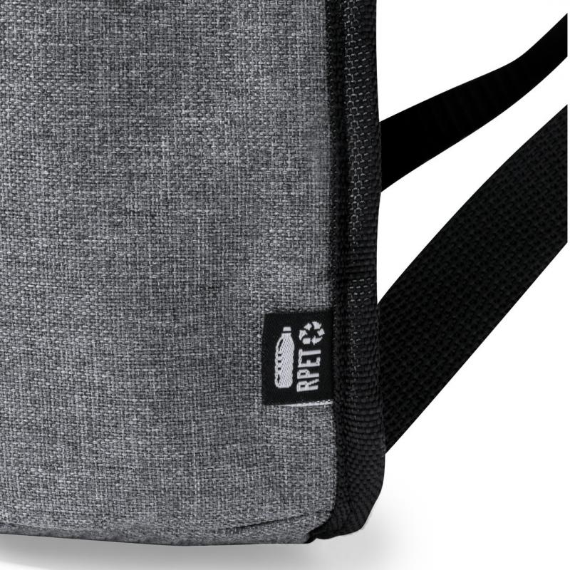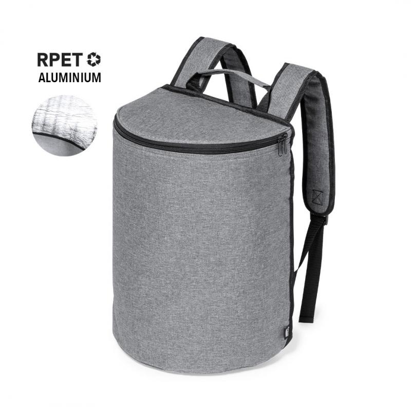 Mochila nevera fabricada en resistente 600D RPET. Acabado en color gris, con asa de transporte. Cintas para hombros acolchadas y ajustables. Compartimento principal con cierre de cremallera y tiradores metálicos. Interior isotermo en aluminio y etiqueta exterior con distintivo RPET.El material RPET se elabora a partir de plástico reciclado, para así fomentar la reutilización de residuos plásticos y ayudar a la sostenibilidad del planeta.