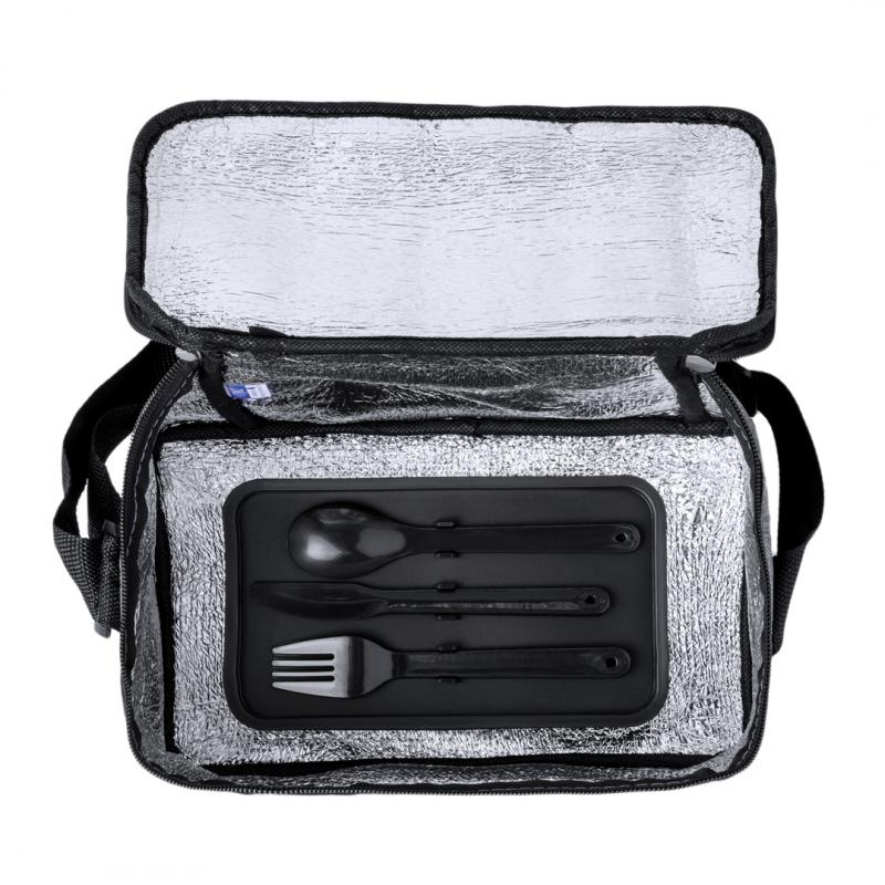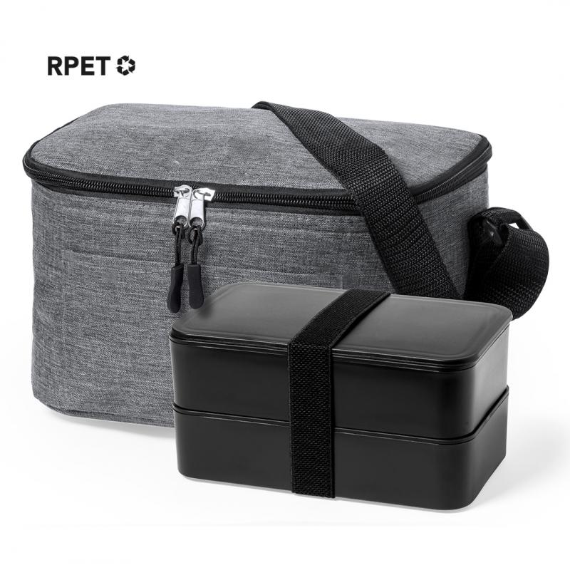 Nevera confeccionada en resistente poliéster 600D RPET con un atractivo efecto melange. Su compartimento principal cuenta con cierre de cremallera y forro interior de aluminio. Además, incorpora un práctico bolsillo exterior y una cinta bandolera ajustable, destacando el logotipo RPET en la etiqueta exterior. Incluye fiambrera con dos compartimentos de 700 ml y cubiertos fabricados en PP reciclado de color negro. Presentado de manera individual en una bolsa reciclada.El material RPET se elabora a partir de plástico reciclado, para así fomentar la reutilización de residuos plásticos y ayudar a la sostenibilidad del planeta.