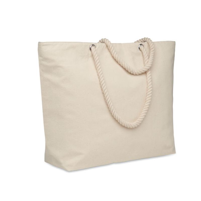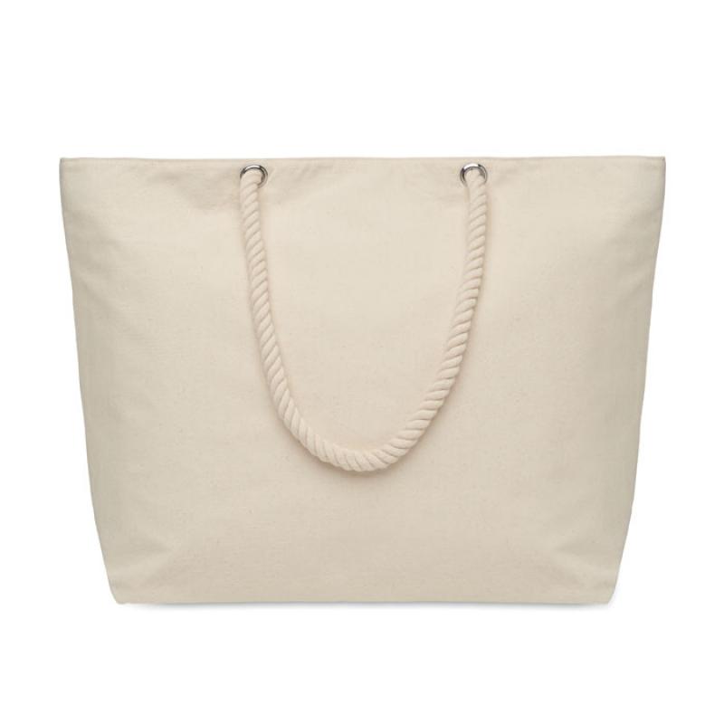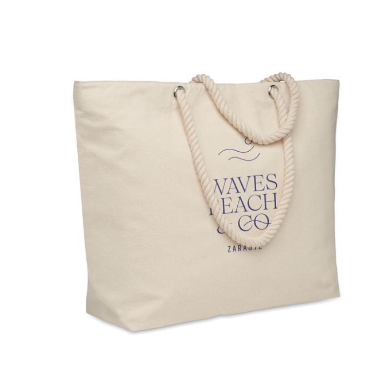 Bolsa nevera de playa de algodón con cremallera y asa de cuerda. 220 gr/m². Aislamiento de aluminio laminado de 2 mm.Recipiente :