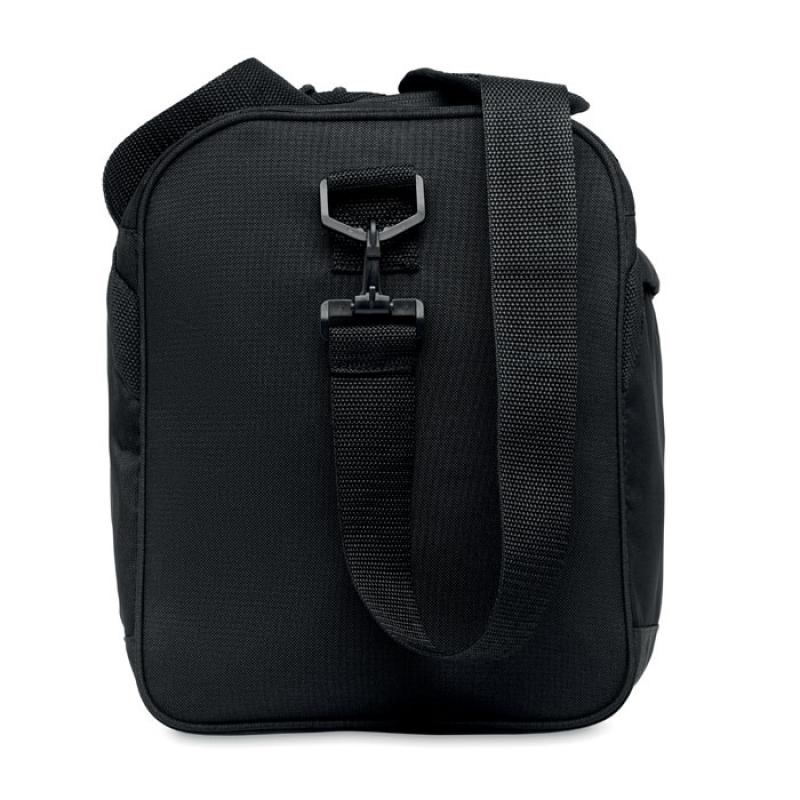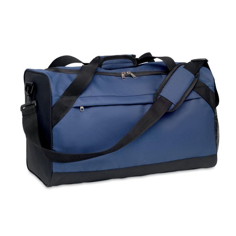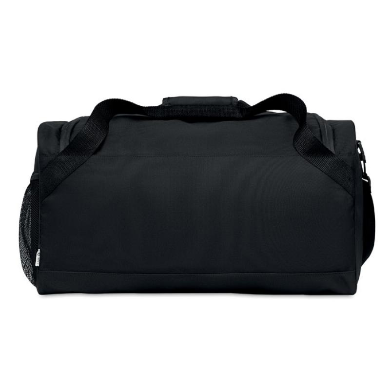 Bolsa de deporte o viaje de RPET 600D con bolsillo frontal e interior con cremallera y con cinta bandolera ajustable y desmontable.