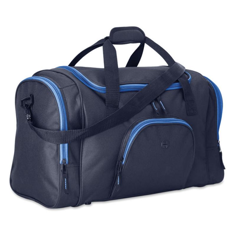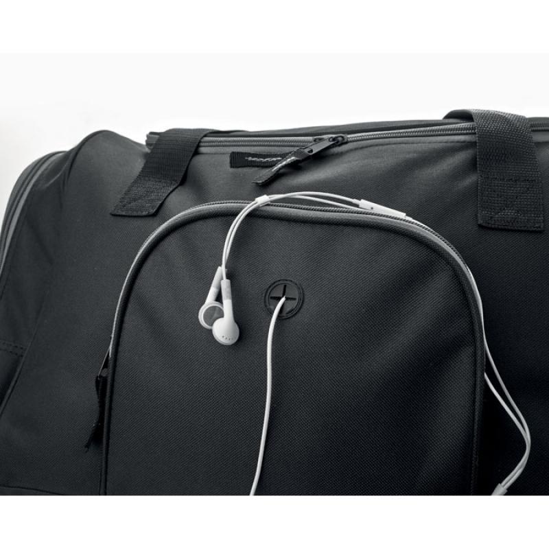 Bolsa de deporte en poliéster 600D con 2 compartimentos laterales con cremallera y 1 bolsillo frontal con cremallera con salida para auriculares . Cinta bandolera desmontable y ajustable.