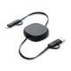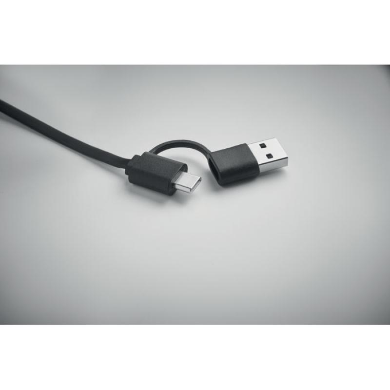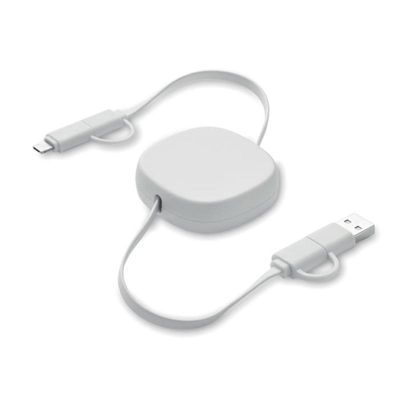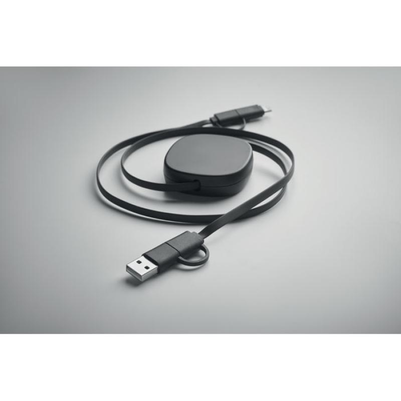 Cable de carga retráctil de 60W. Carcasa de ABS reciclado. Entrada: 2 en 1 Tipo-C y Tipo-A. Salida: Tipo-C y micro-B (2 en 1 clavija). Longitud del cable: 80 cm.Recipiente :
