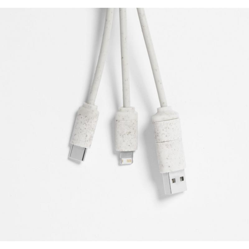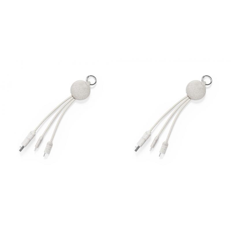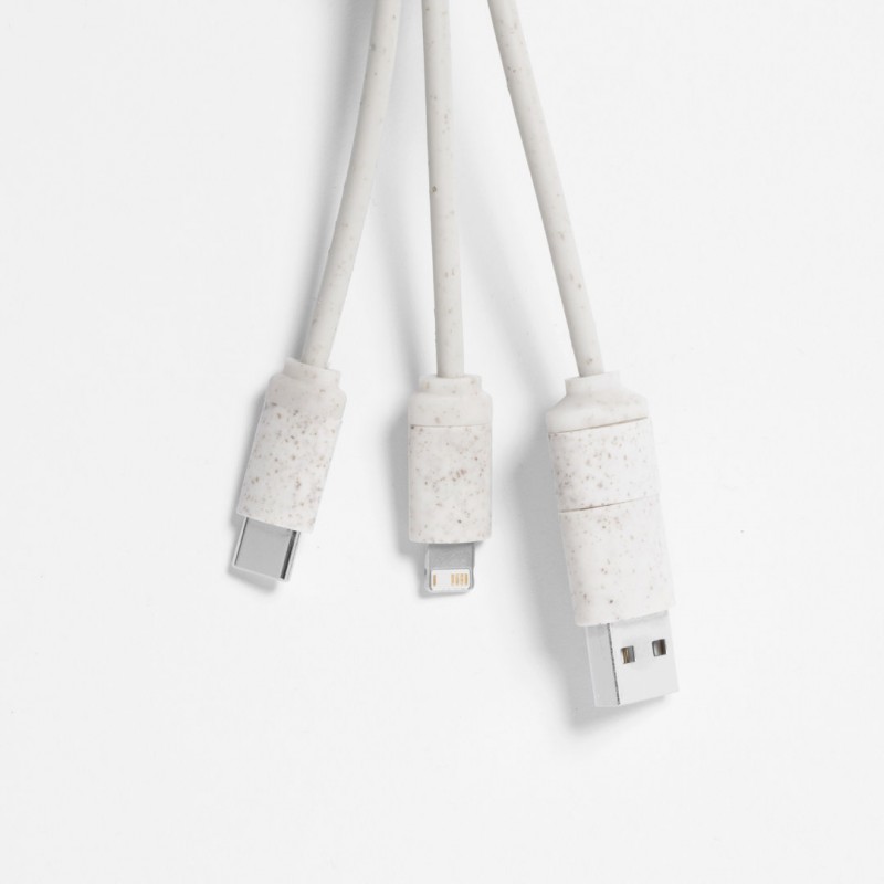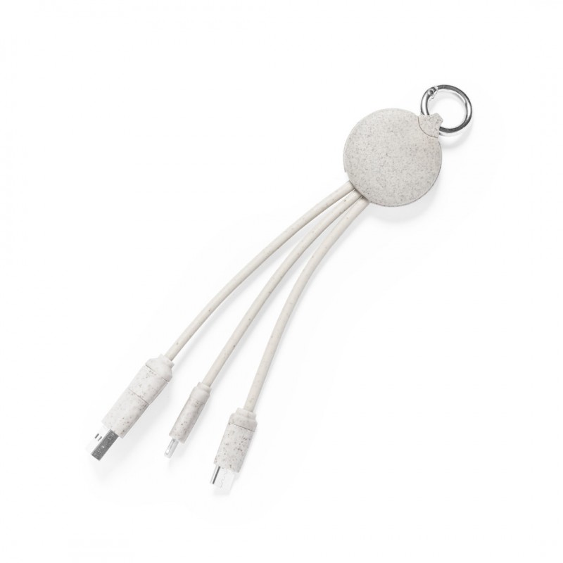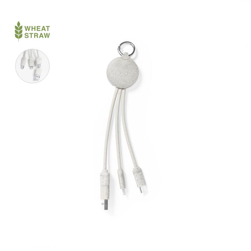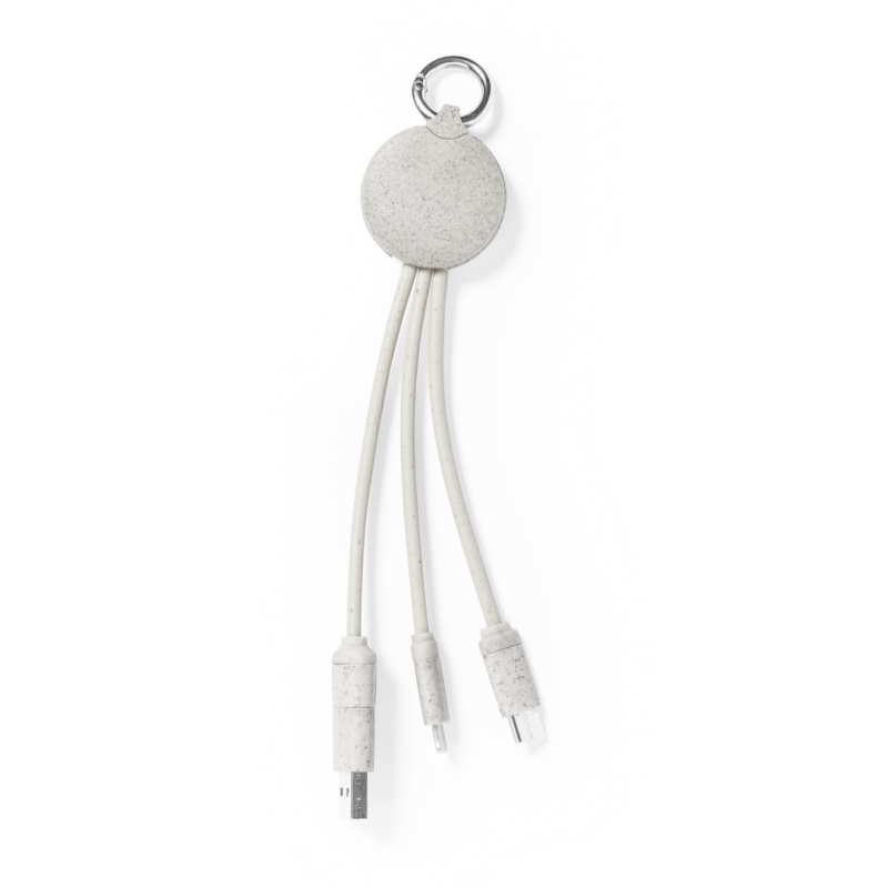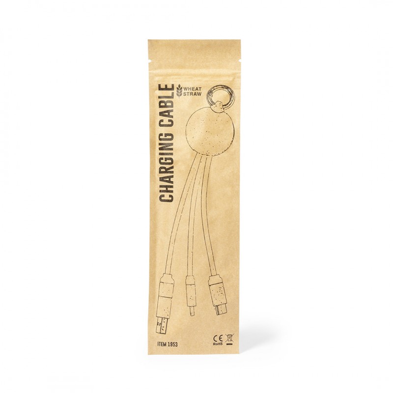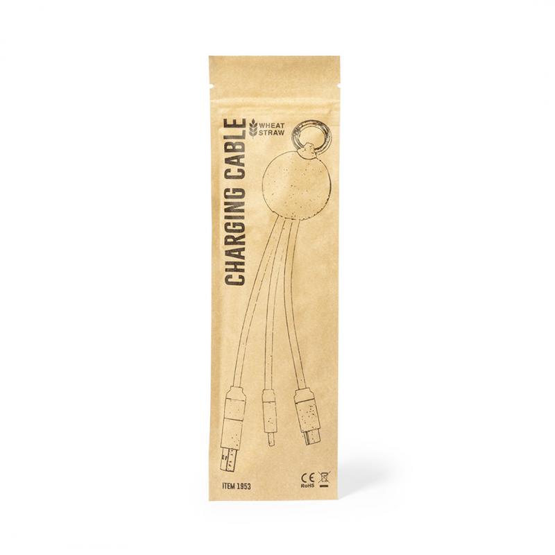Cable cargador con anilla fabricado en caña de trigo, para así fomentar la utilización de materias primas naturales y reducir las emisiones contaminantes. Incluye conexiones de entrada Tipo C y USB salidas Lightning, Micro USB y USB. Presentado en bolsa individual de diseño kraft.