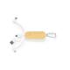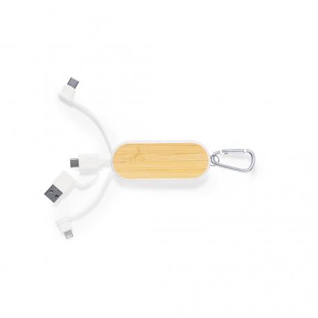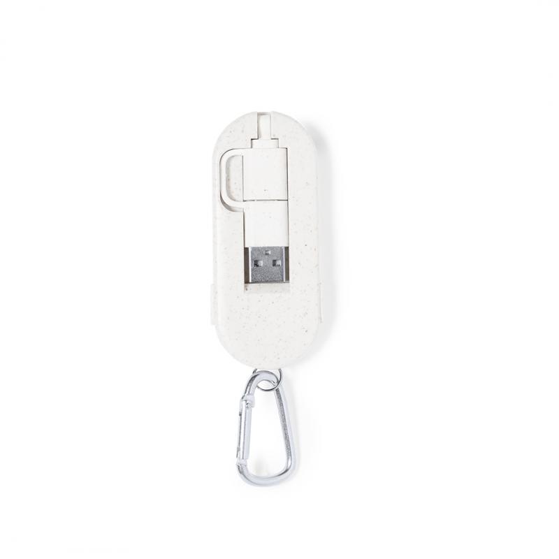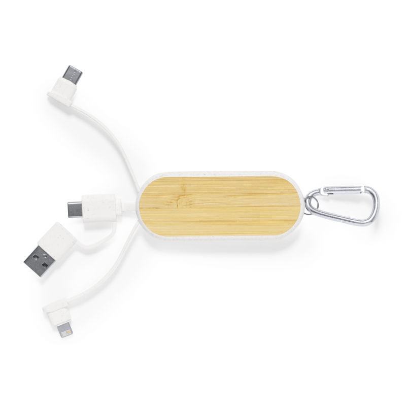Cable cargador con mosquetón fabricado en fibra de trigo y bambú. Con conexiones de entrada Tipo C y USB y salidas Tipo C, lightning y Micro USB. 5V DC 2A. Presentado en bolsa individual de diseño kraft.Elaborado con elementos vegetales para así fomentar la utilización de materias primas naturales y reducir las emisiones contaminantes.