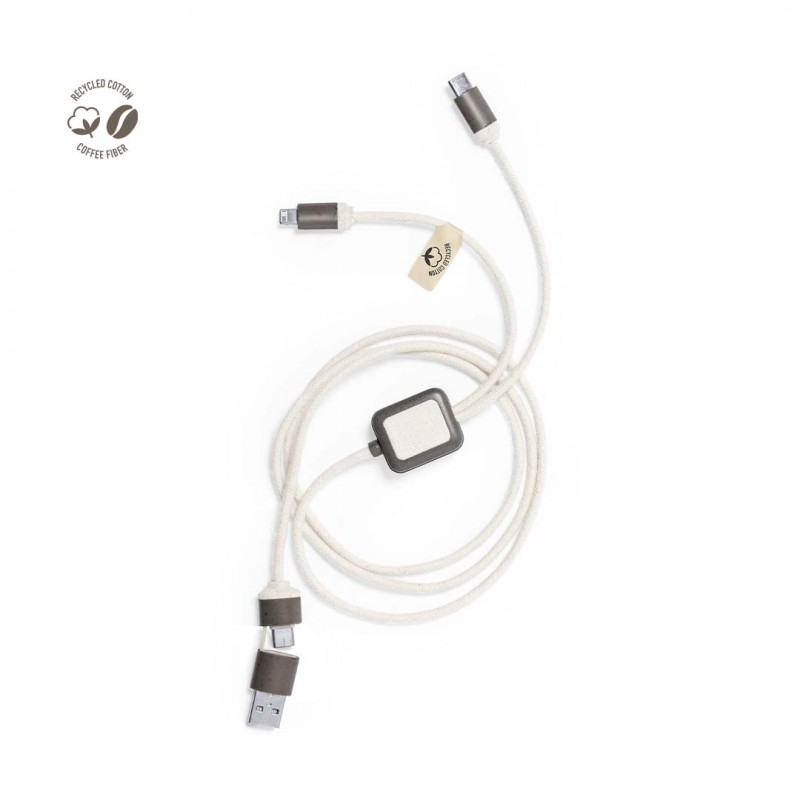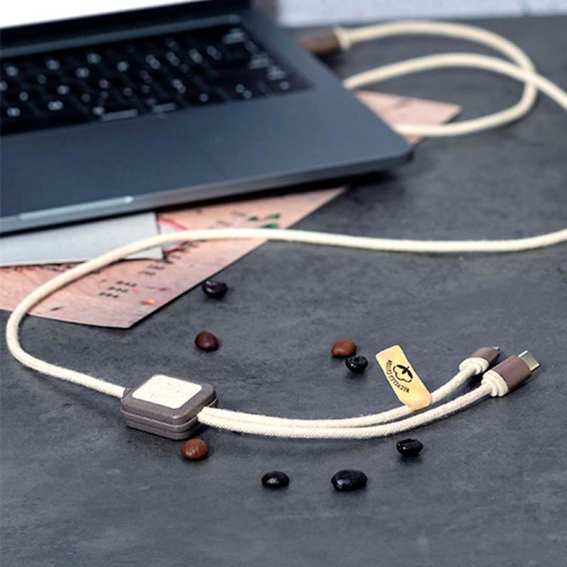Cable cargador fabricado en fibra de café, con cables recubiertos en algodón reciclado. Conexiones de entrada Tipo C y USB, con salidas Tipo C, Lightning y Micro USB. 5V DC 2.4A. Con distintivos de fibra de café y algodón reciclado. Presentado en bolsa individual de diseño kraft con autocierre.La fibra de café es una solución circular que se obtiene de la utilización de los residuos producidos en la obtención del café. Una alternativa sostenible que favorece la reducción del uso de plásticos, ahorrando energía en su proceso de fabricación y contribuyendo al cuidado del medio ambiente. Disponible certificación GRS (Global Recycled Standard / Estándar de Reciclaje Global), que garantiza el origen reciclado del material usado para fabricar el producto.
