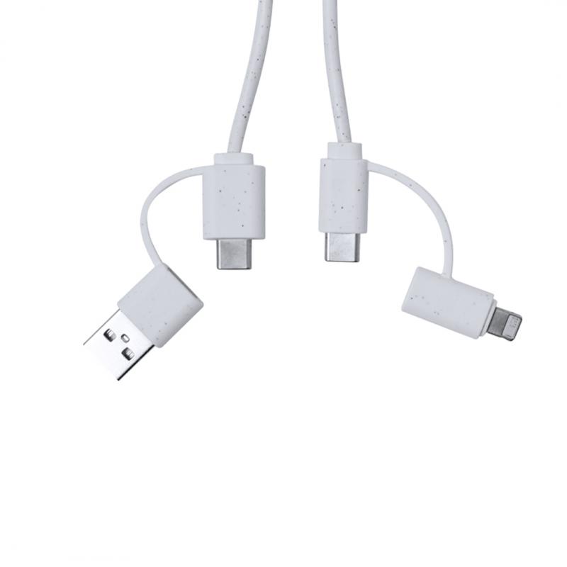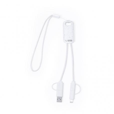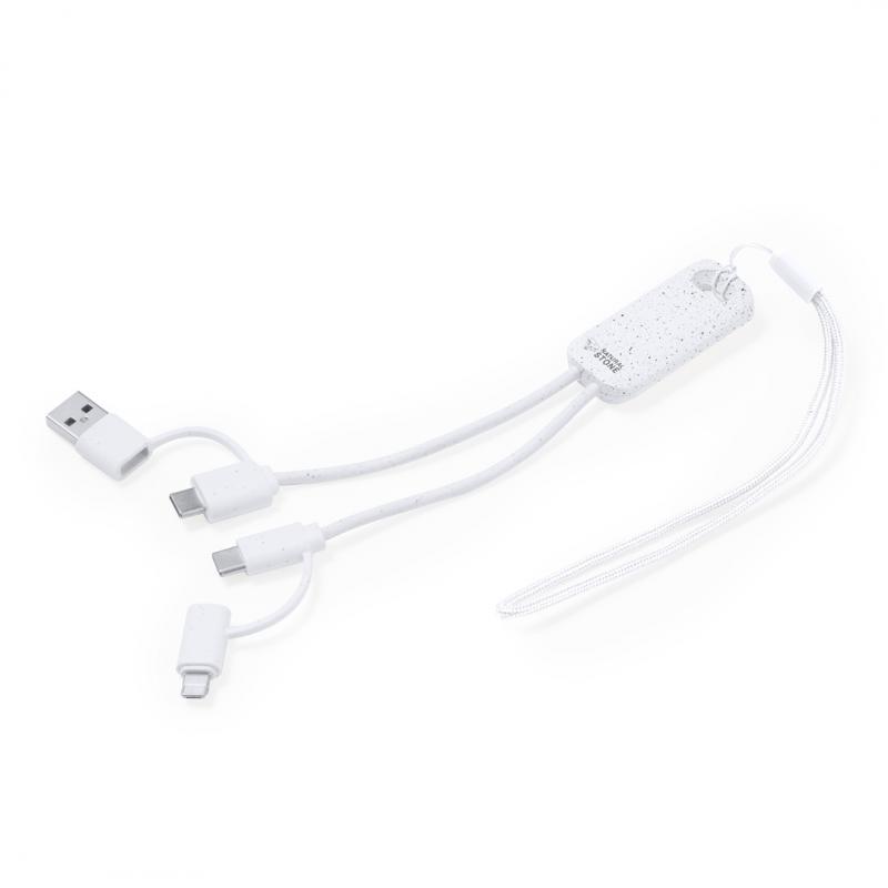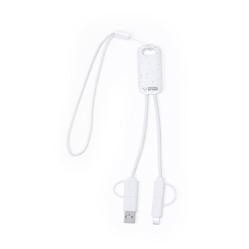 Cable cargador fabricado a partir de extractos de piedra natural en combinación con resistente ABS. Con conexiones de entrada Tipo C/USB y salidas Tipo C, Lightning y Micro USB. 5V DC 2.4A. Presentado en caja individual de diseño kraft.Fabricado con extractos de piedra natural, ayudando a la reducción del uso de plásticos, además de proporcionar un acabado suave y resistente.