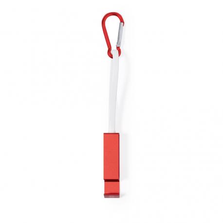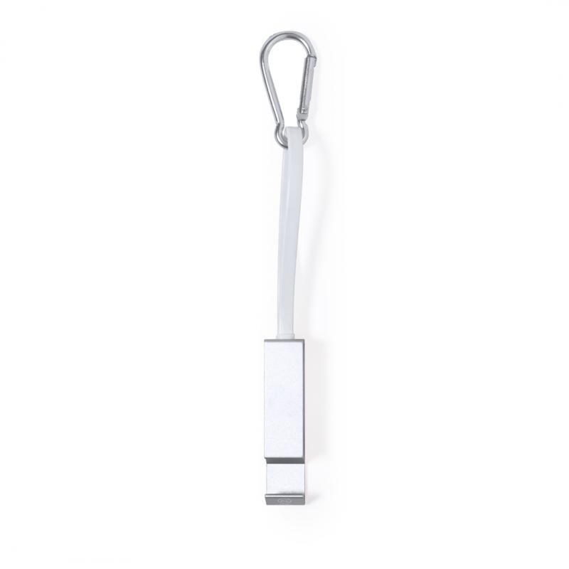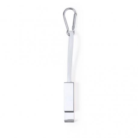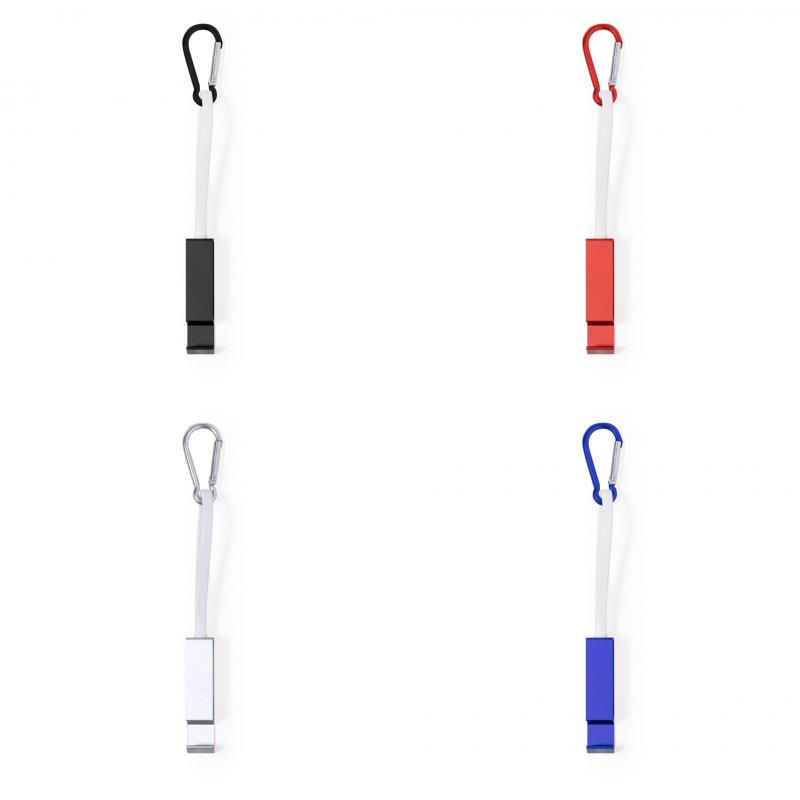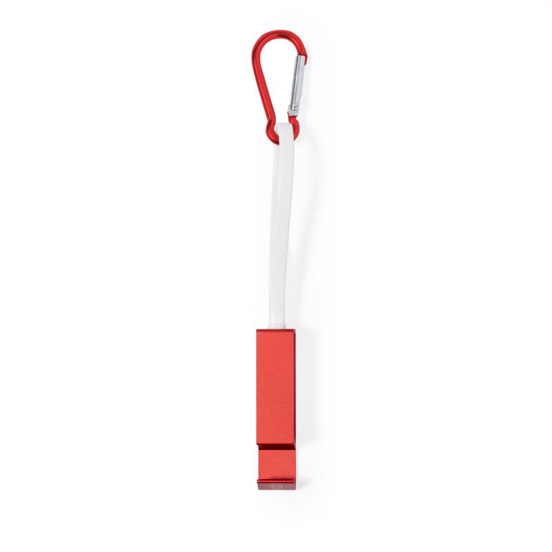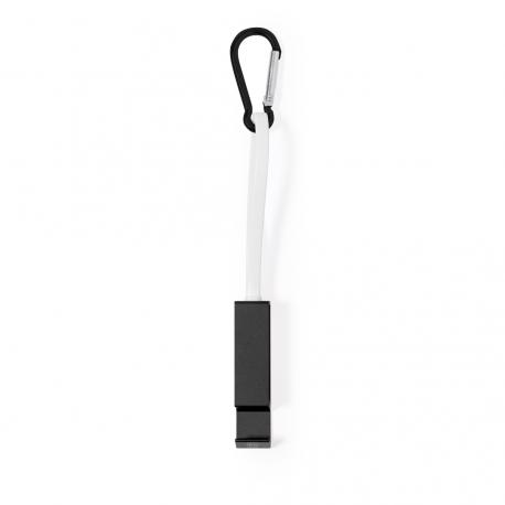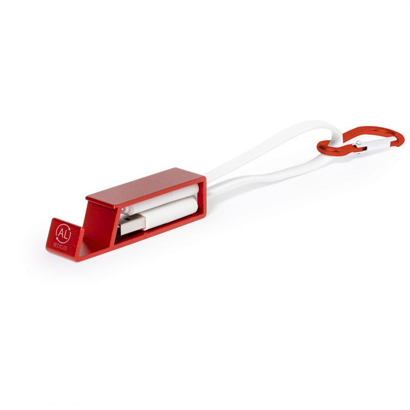 Cable cargador multifunción, fabricado en Aluminio Reciclado y con un ingenioso diseño que permite guardar los cables de carga cómodamente, además de facilitar el transporte. Incluye mosquetón a juego y soporte para smartphone, con conexión Tipo C (entrada y salida) y dual Micro USB / Lightning. En varios colores de acabado metalizado y con logotipo Aluminio Reciclado. Presentado en atractiva bolsa reciclada individual.El Aluminio Reciclado es un material con posibilidades de reciclaje casi infinitas, sin perder sus propiedades originales y consumiendo menos energía en este proceso.Certificación GRS (Global Recycled Standard / Estándar de Reciclaje Global), que garantiza el origen reciclado del material usado para fabricar el producto.