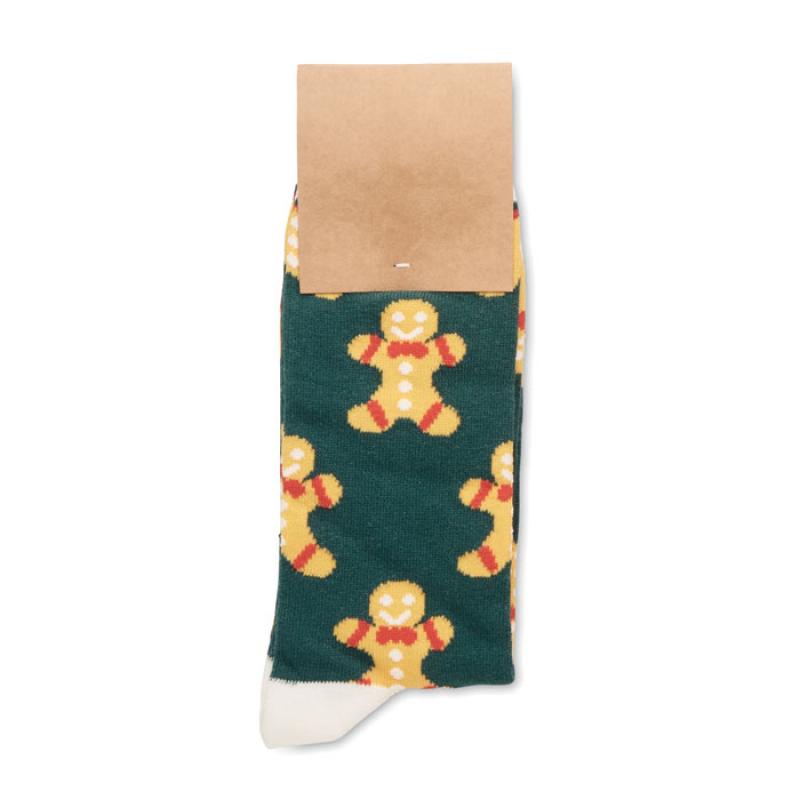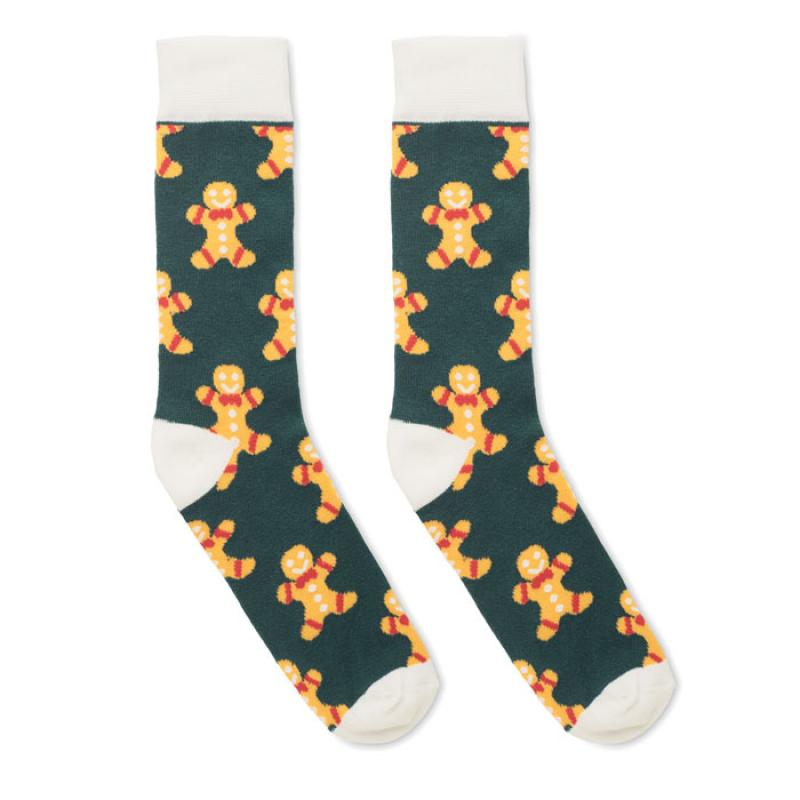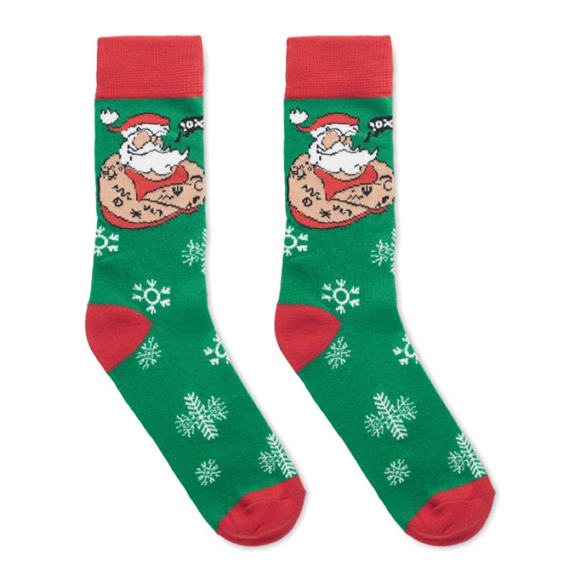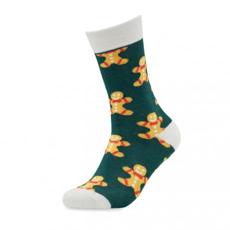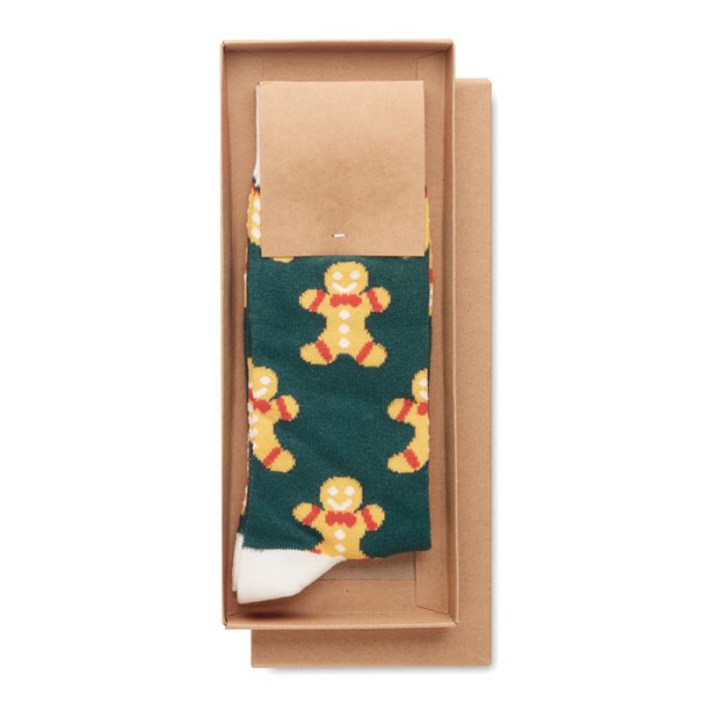 Par de calcetines con motivos navideños en 75% algodón, 23% poliéster RPET y 2% spandex. Presentados en caja de regalo. Talla L = 43-46.