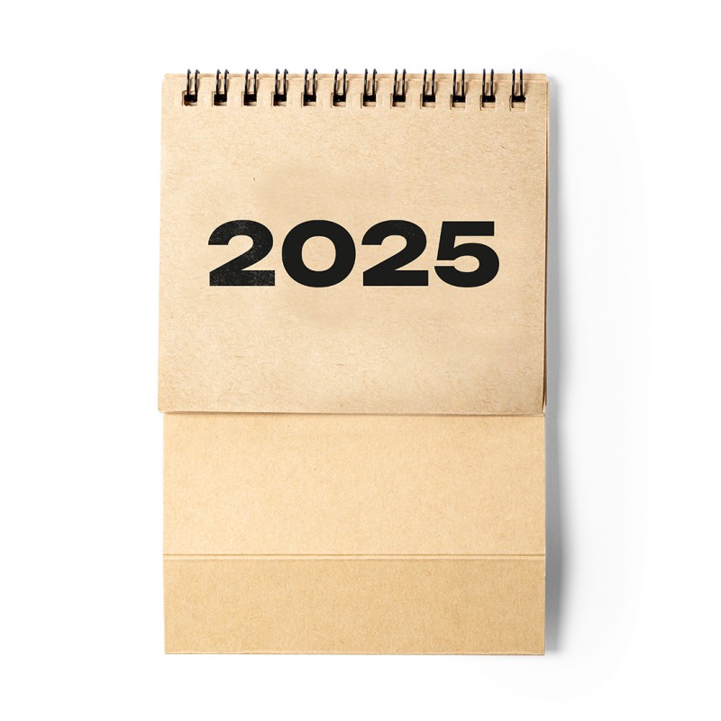 Calendario de sobremesa de línea nature. Fabricado en cartón reciclado, con anillas en color negro. Diseño mes en curso/ mes anterior/ mes siguiente. Amplia superficie de marcaje en ambas caras.