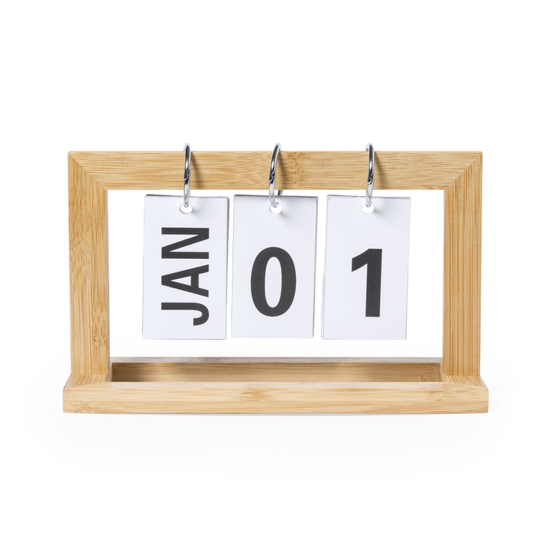 Calendario perpetuo de línea nature: ya no es necesario cambiar de calendario cada año, con el beneficio al medio ambiente que esto supone. Fabricado en bambú, con anillas metálicas cromadas. Tipografía de fácil lectura y especialmente diseñado para marcaje en láser.