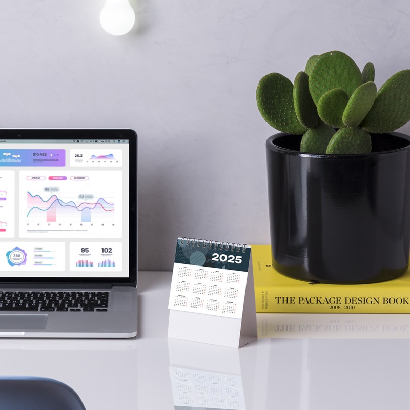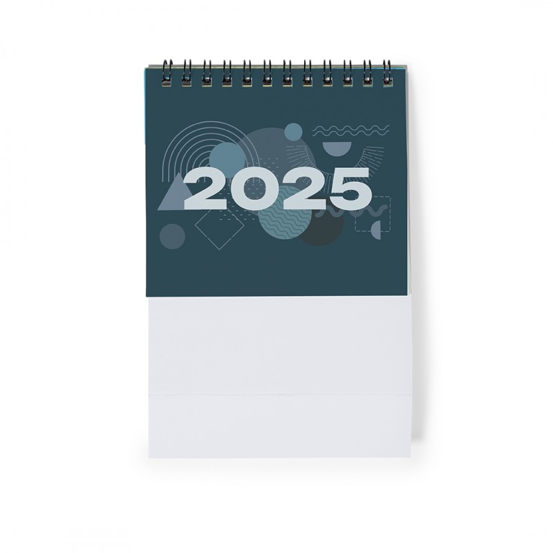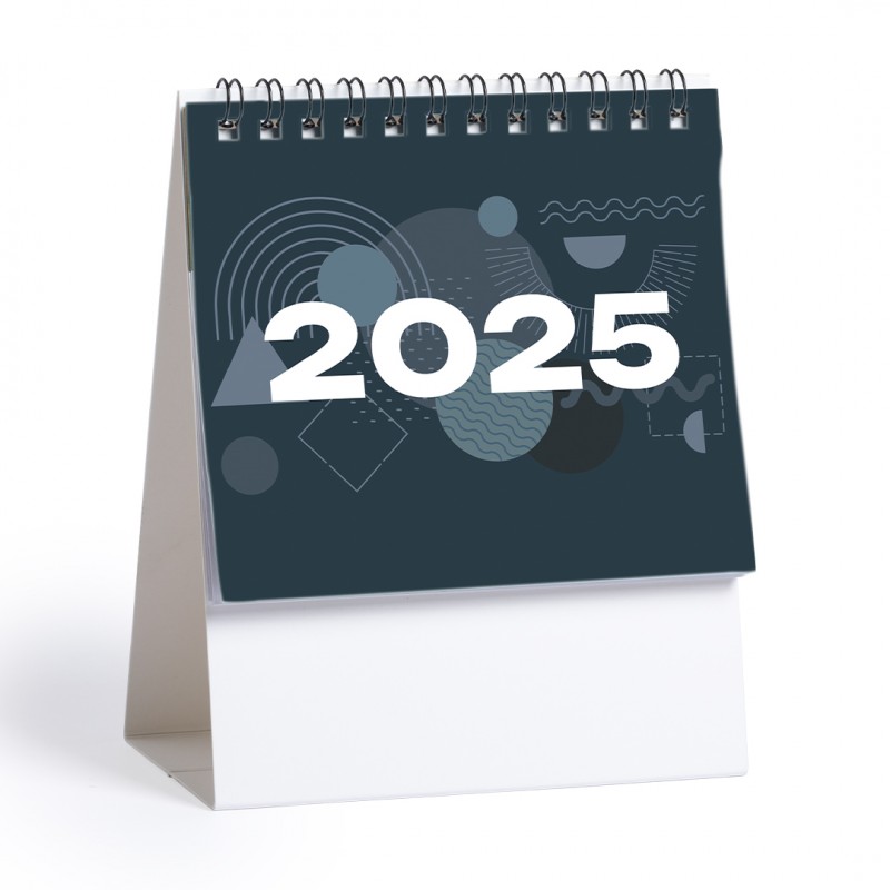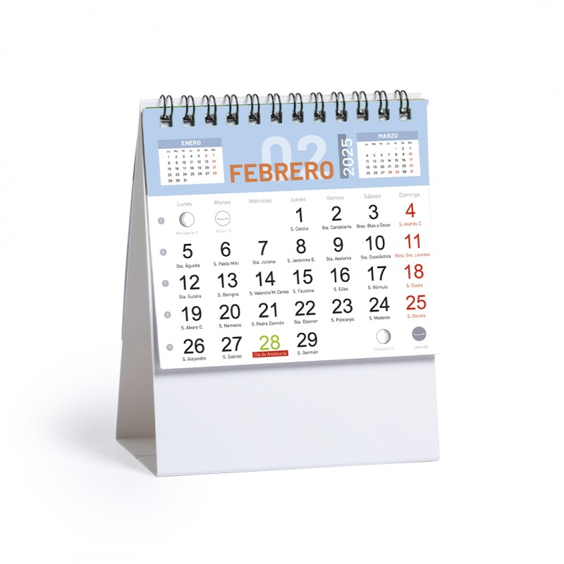Calendario de sobremesa de anillas con cuerpo triangular en cartón. Diseño mes en curso/ mes anterior/ mes siguiente y santoral. Amplia superficie de marcaje en ambas caras.