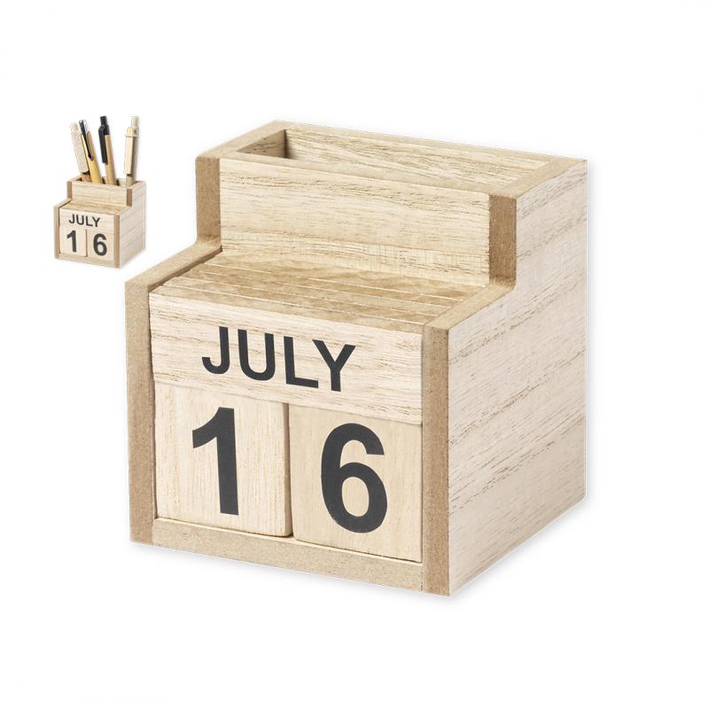Lapicero calendario perpetuo de línea nature: ya no es necesario cambiar de calendario cada año, con el beneficio al medio ambiente que esto supone. Fabricado en MDF, con tipografía de fácil lectura. Presentado en caja individual de diseño kraft.