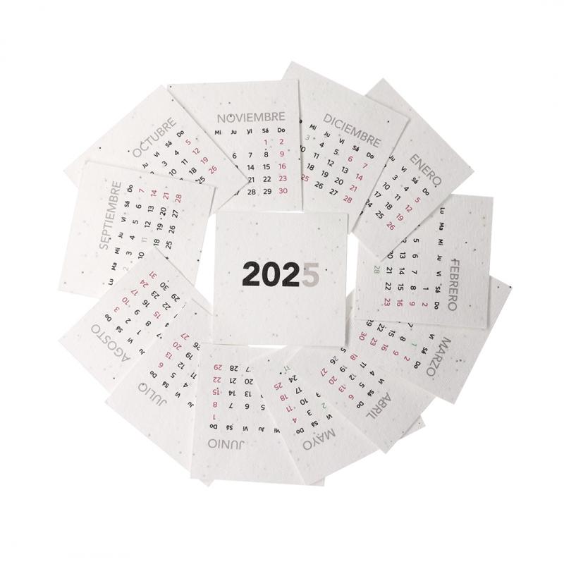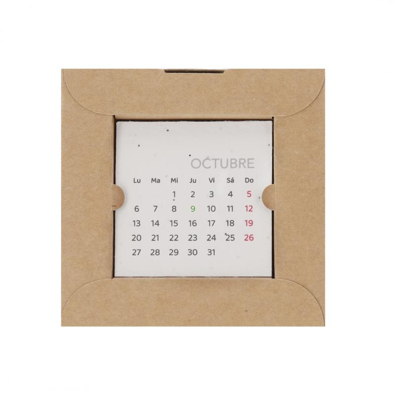 Calendario plantable fabricado en papel de semilla. Incluye 13 hojas con semillas de petunia de colores surtidos, convirtiéndolo en papel plantable después de su vida útil. Diseño de mes en curso, con festividades nacionales marcadas en rojo y autonómicas en verde. Presentado en caja soporte de cartón.