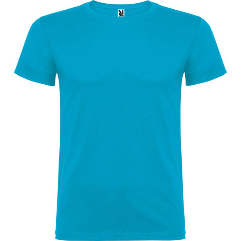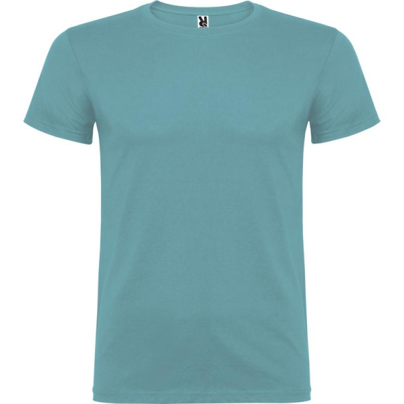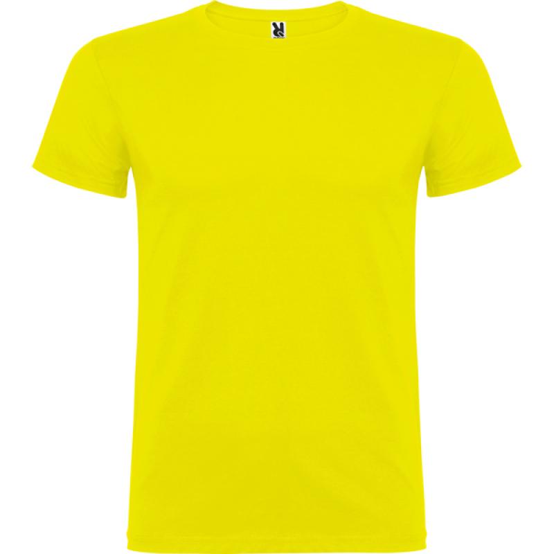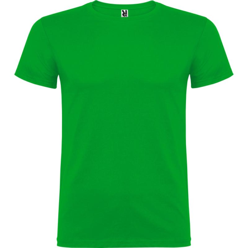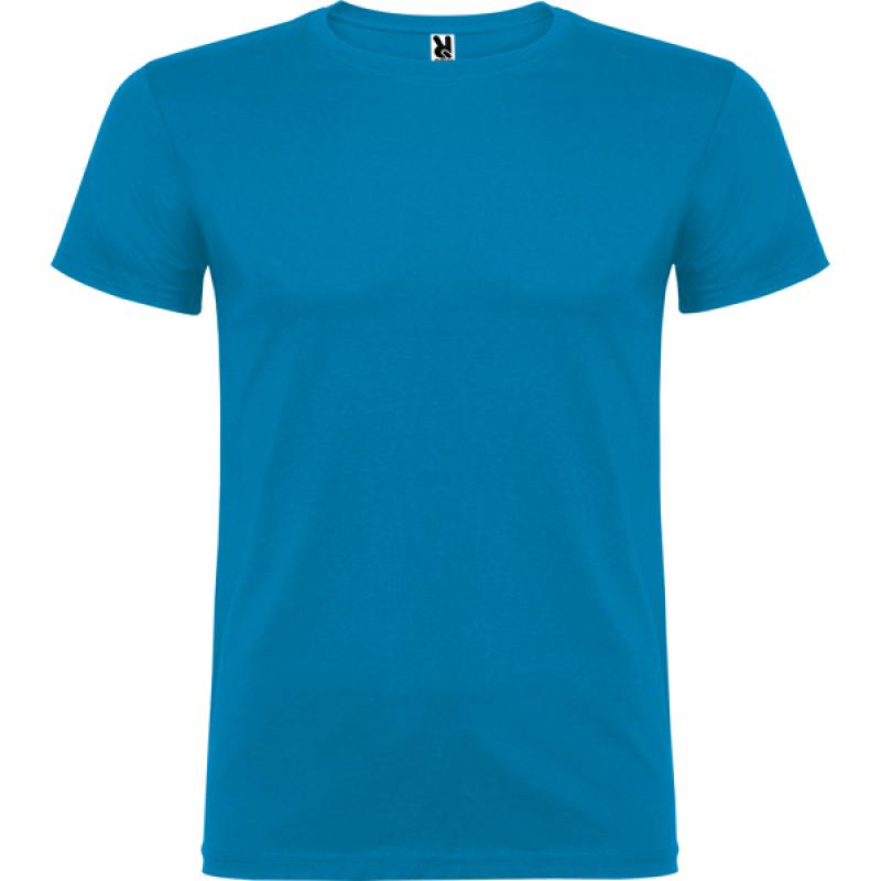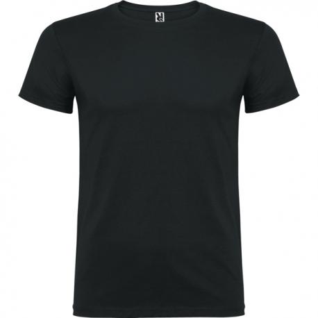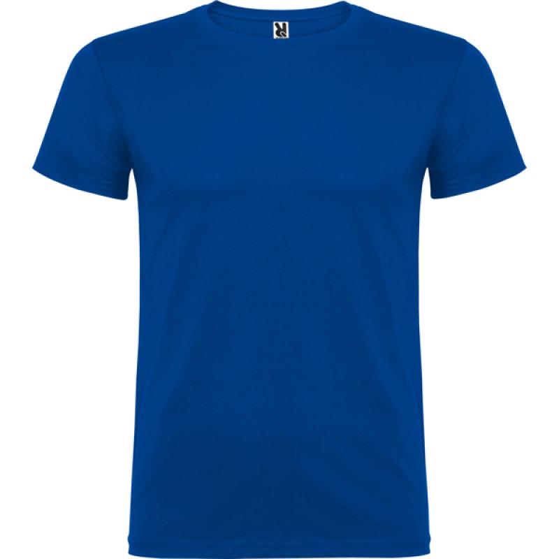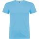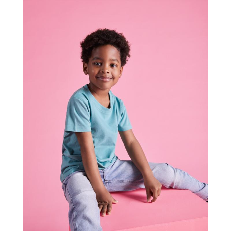 Camiseta de manga corta de cuello redondo doble con elastano, confeccionada en tejido tubular en tallas de adulto, y con costuras laterales en tallas de niño, con cubrecosturas reforzado en cuello.