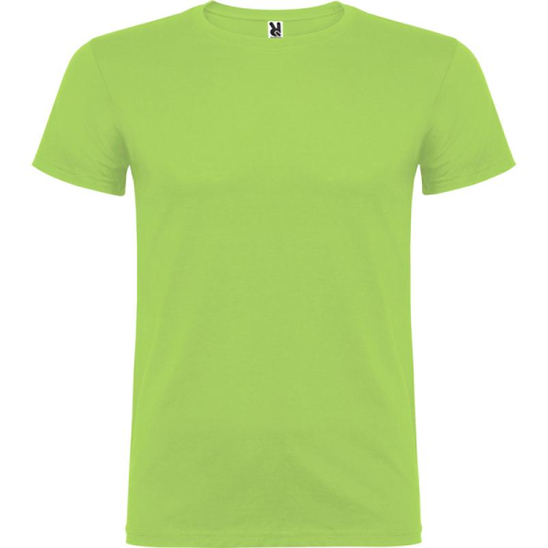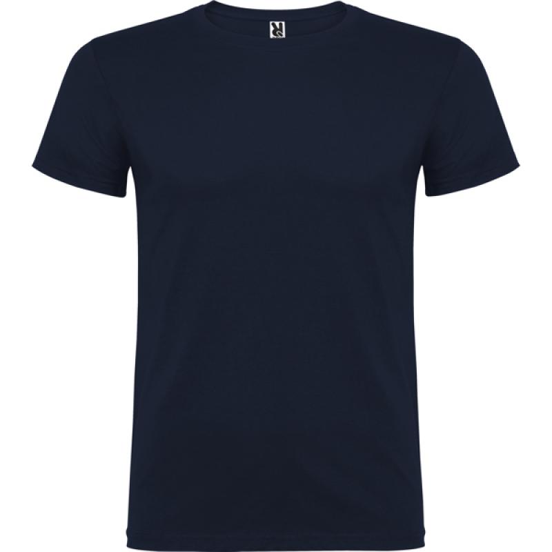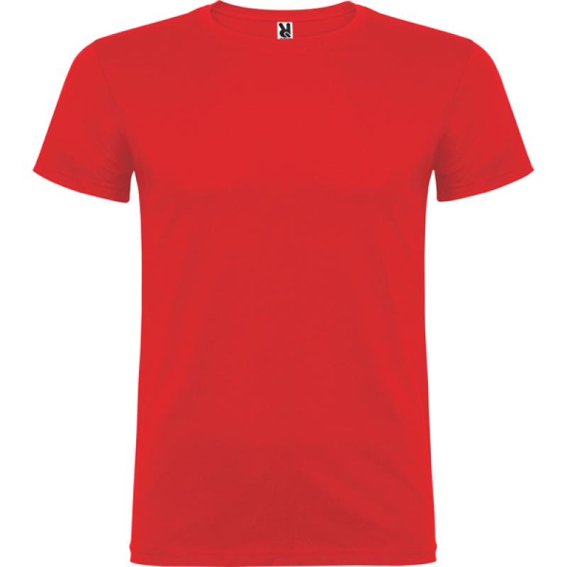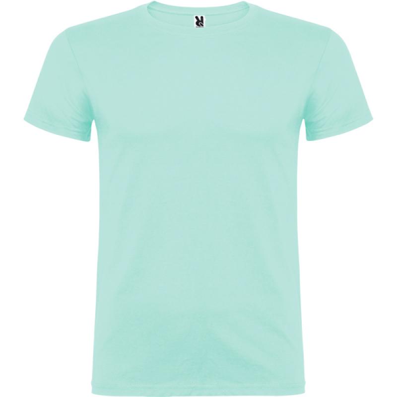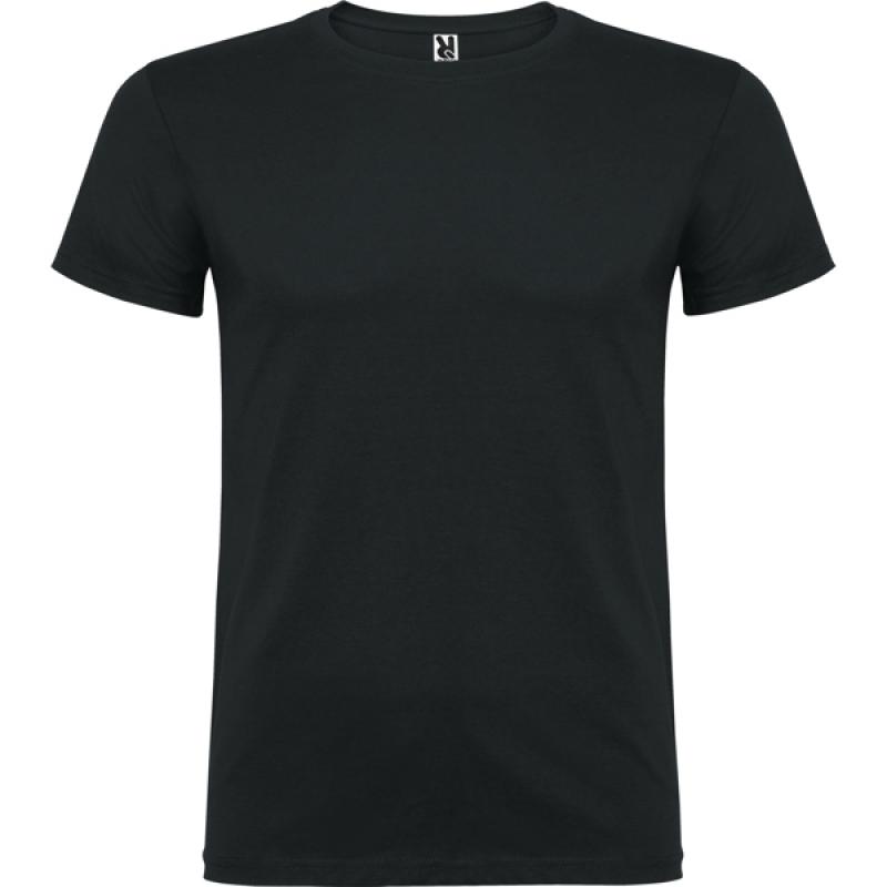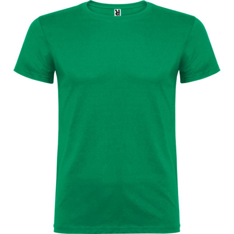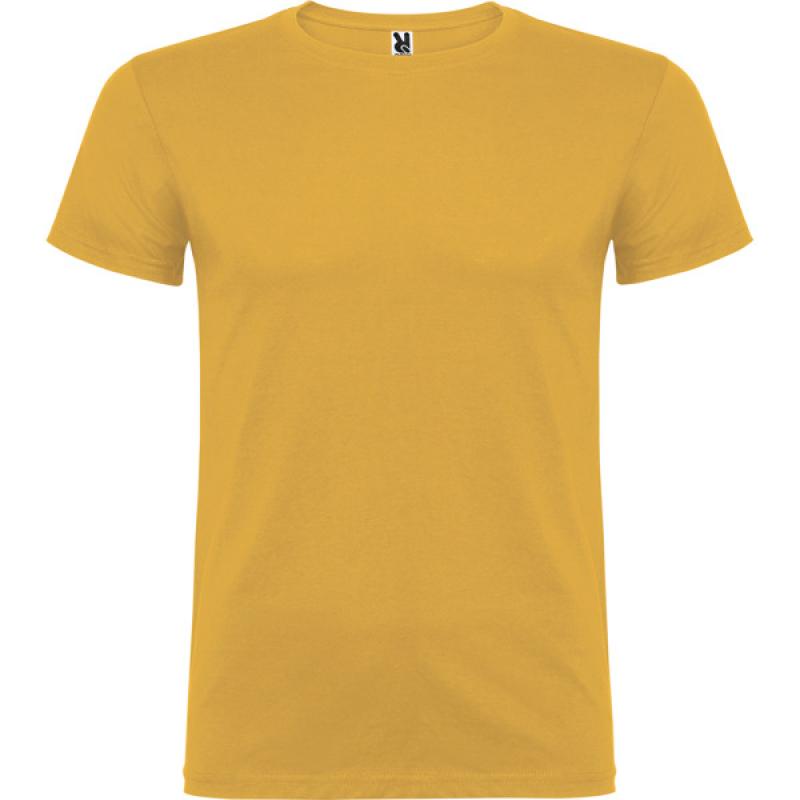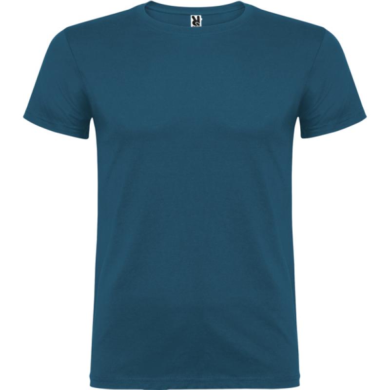 Camiseta de manga corta de cuello redondo doble con elastano, confeccionada en tejido tubular en tallas de adulto, y con costuras laterales en tallas de niño, con cubrecosturas reforzado en cuello.
