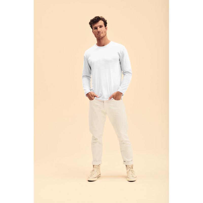 Camiseta adulto blanca Iconic Long Sleeve de Fruit Of The Loom. Manga larga, fabricada en material 100% algodón peinado Ring Spun de 140g/m2. De tacto suave y corte clásico, con cuello redondo estrecho de canalé 1x1 y tapeta a juego. Etiqueta fácilmente removible y disponible en tallas S, M, L, XL, XXL.