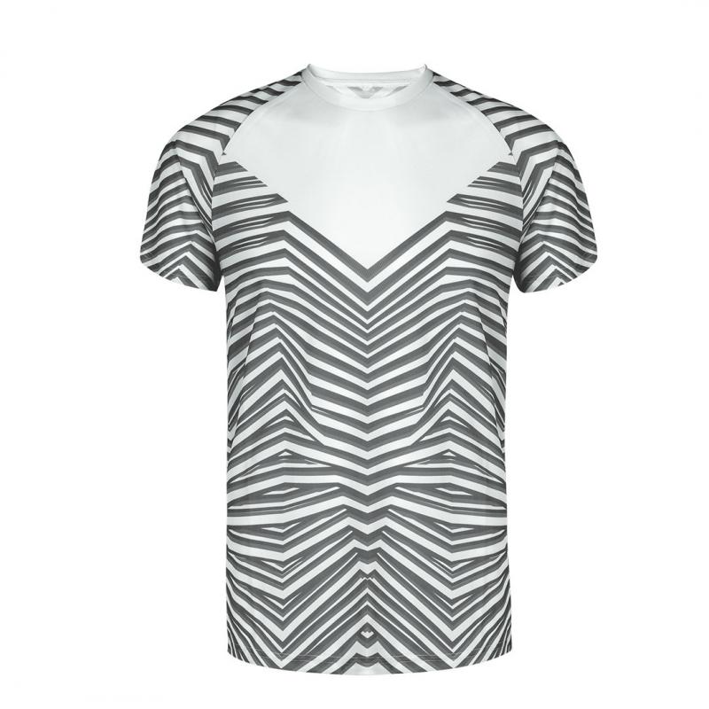 Camiseta técnica para adulto en poliéster de 135g/m2, transpirable y de suave tacto. Con innovador estampado a rayas y una zona lisa en el pecho para personalización. Con manga ranglán y cuello redondo. Disponible en variada gama de colores y en tallas XS, S, M, L, XL, XXL.