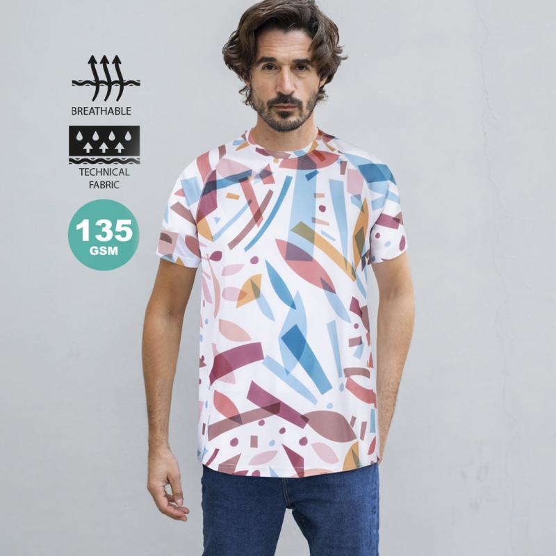 Camiseta técnica para adulto con innovador y original estampado. Confeccionada en poliéster de 135g/m2, transpirable y de suave tacto. Manga ranglán, cuello redondo y disponible en tallas XS, S, M, L, XL, XXL.