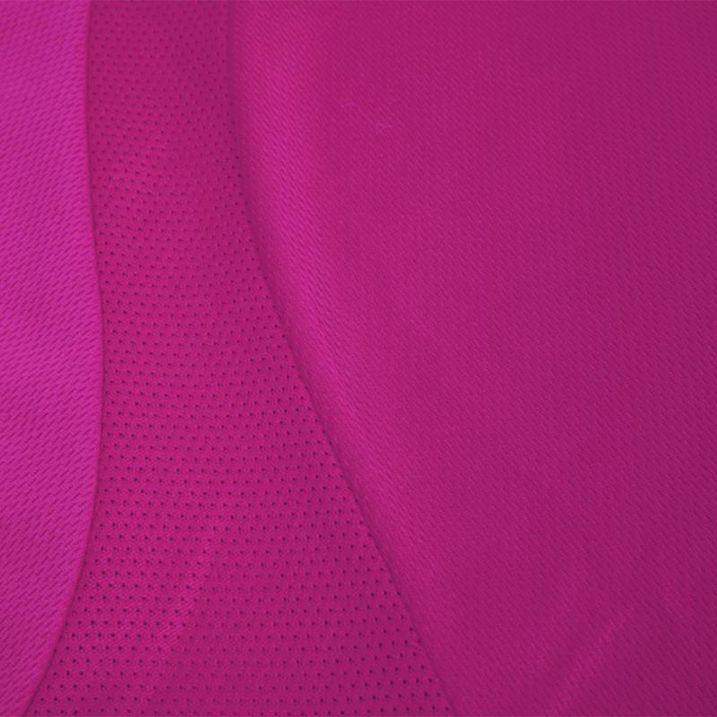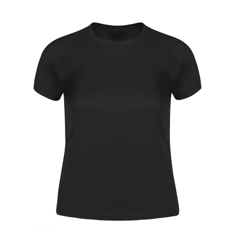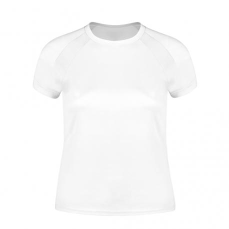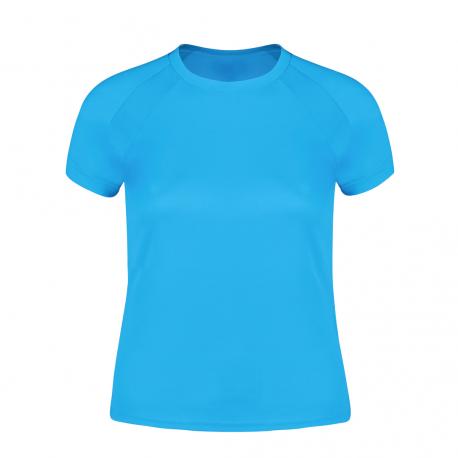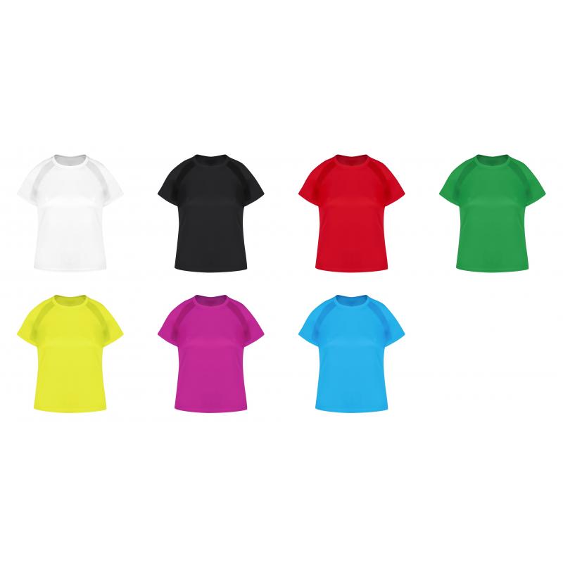 Camiseta técnica para mujer en material 100% poliéster transpirable de 135g/m2. Con manga ranglán, cuello redondo y con bandas frontales y laterales en tejido transpirable microperforado. Disponible en tallas S, M, L, XL.