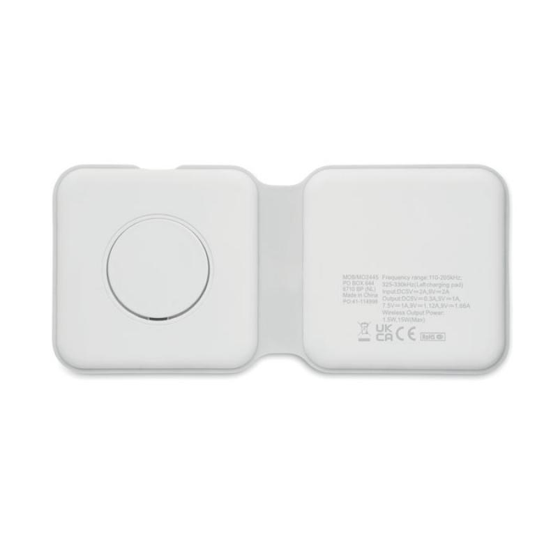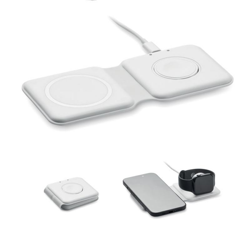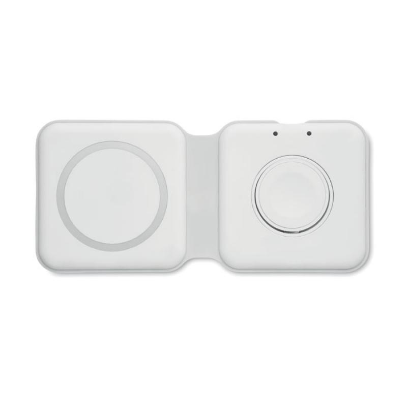 Base de carga plegable 2 en 1 en ABS. Incluye un cargador inalámbrico de 15 W y un cargador para smartwatch (solo Apple®).Recipiente :