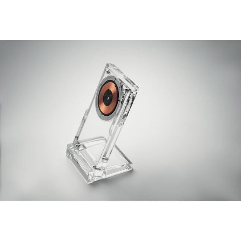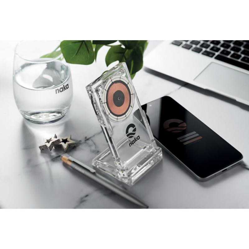 Cargador inalámbrico (15 W) en acrílico con soporte para teléfono. Al conectarlo a una fuente de alimentación, cargará tu dispositivo móvil de forma inalámbrica. Salida: 9V/1,67A (15W) para una carga rápida.Recipiente :