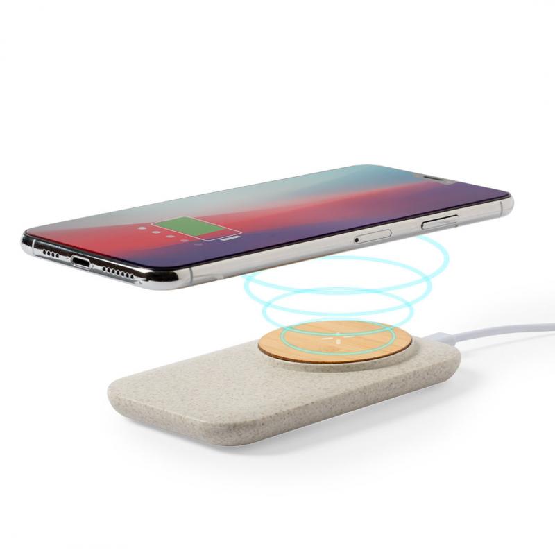 Cargador inalámbrico de línea nature. Hecho en bambú en combinación con caña de trigo, para así fomentar la utilización de materias primas naturales y reducir las emisiones contaminantes. Indicador de estado de carga y compatible con dispositivos equipados con tecnología de carga inalámbrica. Amplia superficie de marcaje y presentado en atractiva caja de diseño eco. Cable incluido.
