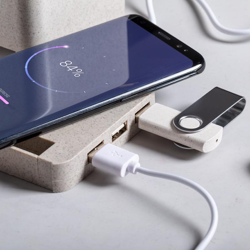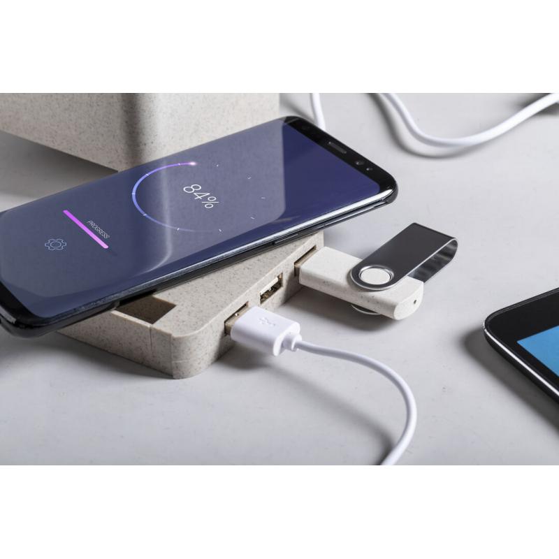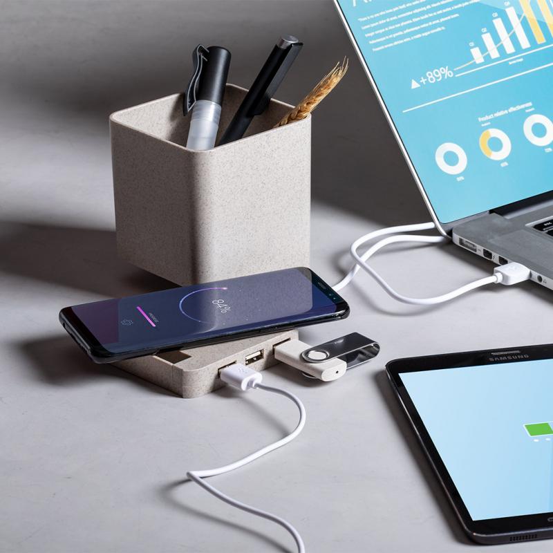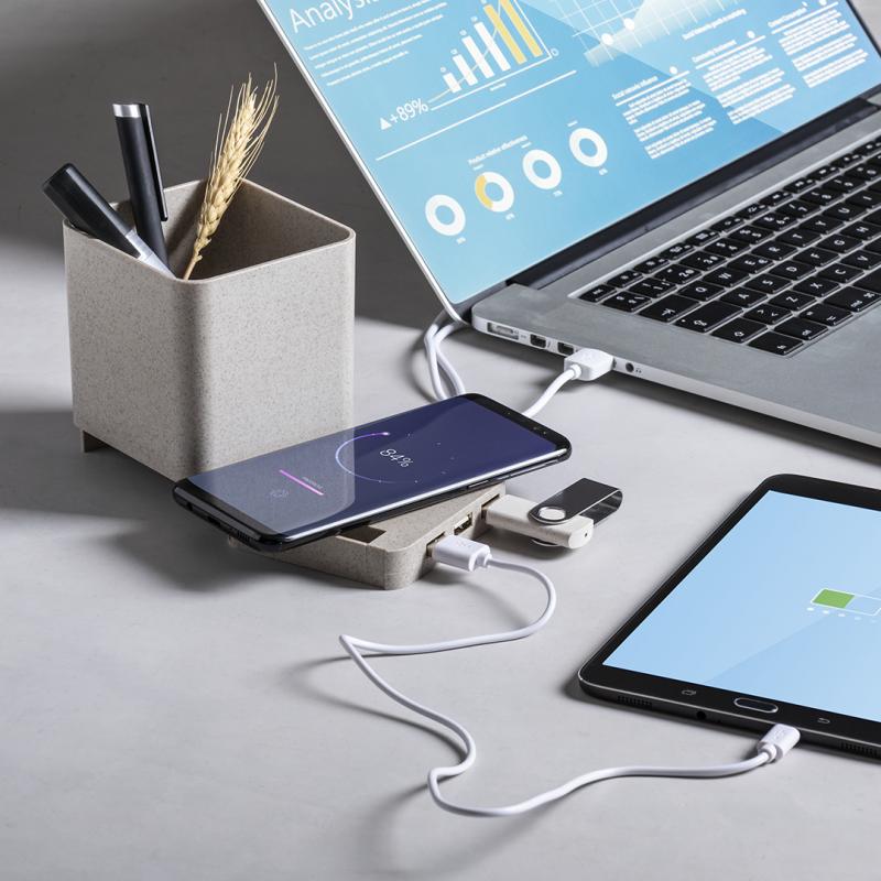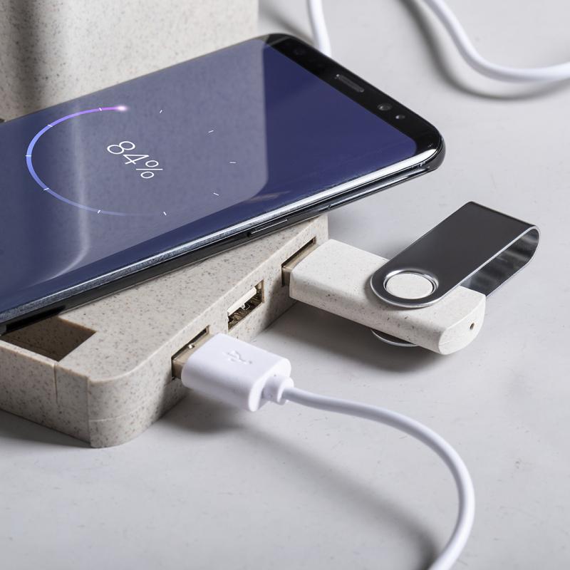 Lapicero multifunción 4 en 1 de línea nature. Carcasa en caña de trigo, para así fomentar la utilización de materias primas naturales y reducir las emisiones contaminantes. Con funciones lapicero, soporte para smartphone, cargador inalámbrico y puerto USB (3xUSB 2.0). Compatible con smartphones con tecnología de carga inalámbrica, incluye cable micro USB en color blanco de 1 metro de largo. Presentado en atractiva caja de diseño eco. Disponible manual de instrucciones en español e inglés.