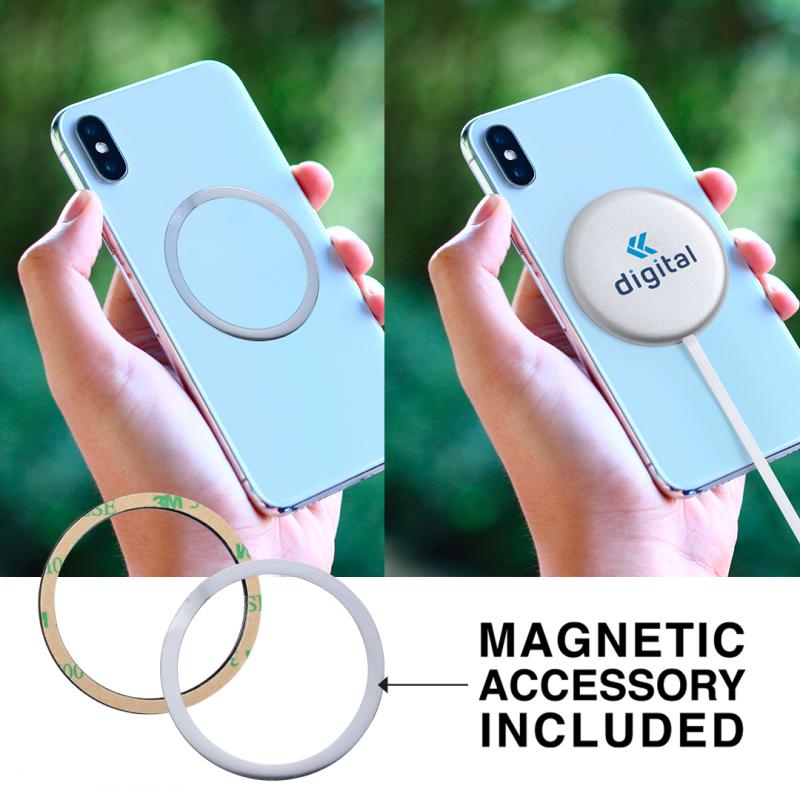 Cargador inalámbrico magnético 10W. Carcasa fabricada en resistente aluminio de acabado plateado. Con indicador de estado de carga y cable USB de 1m con conector de aluminio. Incluye accesorio metálico con adhesivo 3M, de fijación extra fuerte y libre de residuo al despegarlo del dispositivo, permitiendo así el uso de la función magnética del cargador en cualquier dispositivo móvil. Compatible con terminales equipados con tecnología de carga inalámbrica. Amplia superficie de marcaje y presentado en atractiva caja de diseño. Disponible manual de instrucciones en español e inglés.