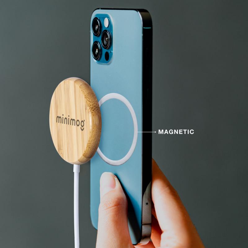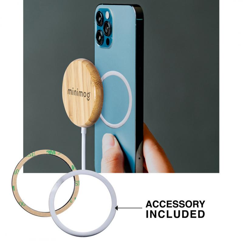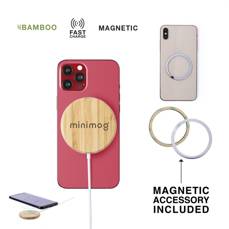 Cargador inalámbrico magnético 10W de línea nature, con carcasa fabricada en resistente bambú. Con indicador de estado de carga y cable USB de 1m. Incluye accesorio metálico con adhesivo 3M, de fijación extra fuerte y libre de residuo al despegarlo del dispositivo, permitiendo así el uso de la función magnética del cargador en cualquier dispositivo móvil. Compatible con terminales equipados con tecnología de carga inalámbrica. Amplia superficie de marcaje y presentado en atractiva caja de diseño eco. Disponible manual de instrucciones en español e inglés.