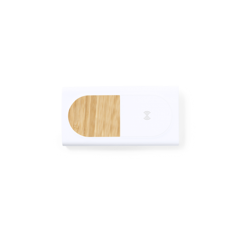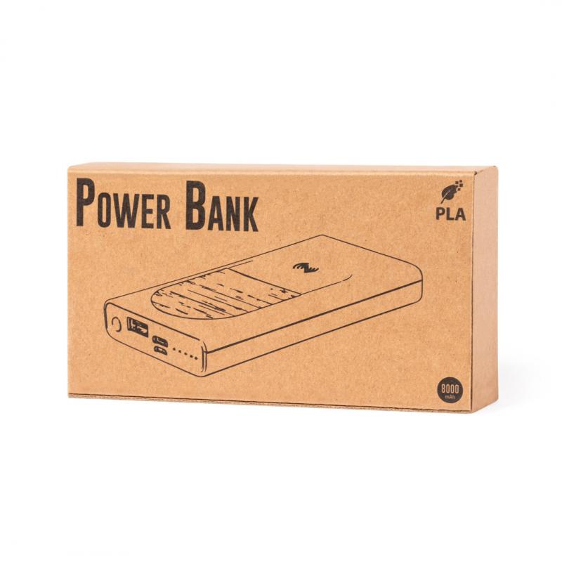 Batería auxiliar externa de línea nature con cargador inalámbrico integrado y función carga rápida de 15W. Carcasa fabricada en combinación de bambú y PLA -Ácido PoliLáctico-, que se obtiene a partir de recursos 100% naturales como el almidón de maíz, la yuca o la caña de azúcar, pudiendo convertirse en 100% compostable al final de su ciclo de vida útil. 8.000 mAh de capacidad, con indicador de estado de carga. Conector dual de entrada y salida Tipo C, entrada micro USB y 1 salida USB. Cable de carga micro USB incluido. Compatible con dispositivos equipados con tecnología de carga inalámbrica. Amplia superficie de marcaje y presentado en atractiva caja de diseño eco. Distintivo PLA sobre el artículo. Las capacidades mostradas en todas nuestras baterías auxiliares externas son reales, incorporando todas ellas baterías de grado A y no recicladas, con una vida útil de al menos 500 ciclos de carga y según normativa CE. Además, están fabricadas conforme a los estándares RoHS y en cumplimiento con los siguientes requisitos de seguridad: Sistema de protección contra sobrecarga del power bank. Sistema de protección contra descarga completa que proporciona una mayor durabilidad del power bank. Sistema de bloqueo para evitar cortocircuitos. Sistema de transferencia de carga constante, acorde con la capacidad del dispositivo de destino.