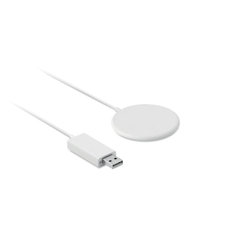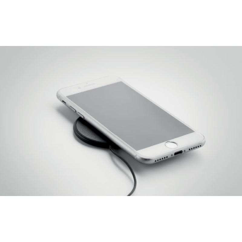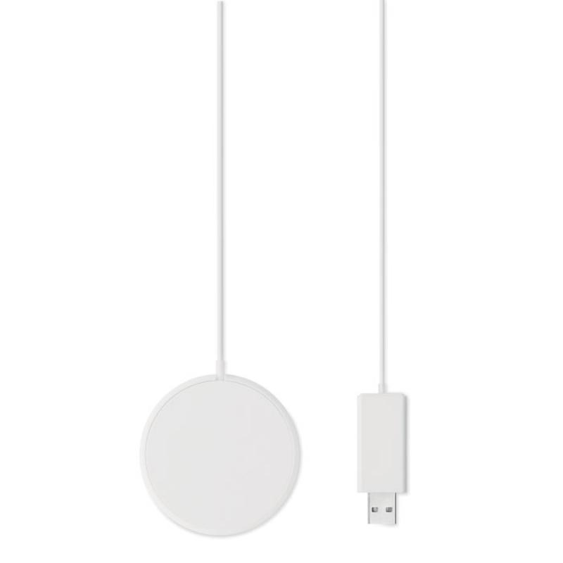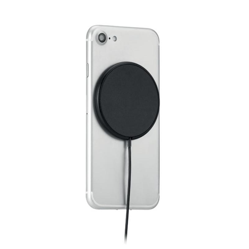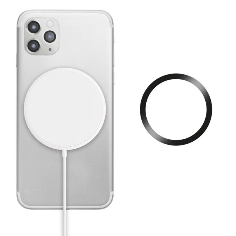 Cargador inalámbrico magnético en ABS. Salida: DC 9V / 1.1A (10W) para carga rápida. Compatible con iPhone® 12 y posteriores. Incluye un anillo metálico magnético adicional para soportar la carga de otros teléfonos inalámbricos recargables no magnéticos.